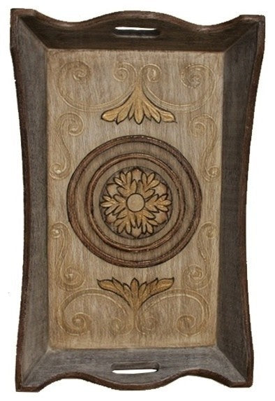 Style your living space in a snap with this charming accent piece. This tray features an intricate floral and scroll design and a scalloped edge for an elegant look. Two handles make it easy and convenient to transport. Style it on a dining table or coffee table for a centerpiece full of personality, or use it as a tray for drinks or appetizers in a bar area for stylish entertaining.