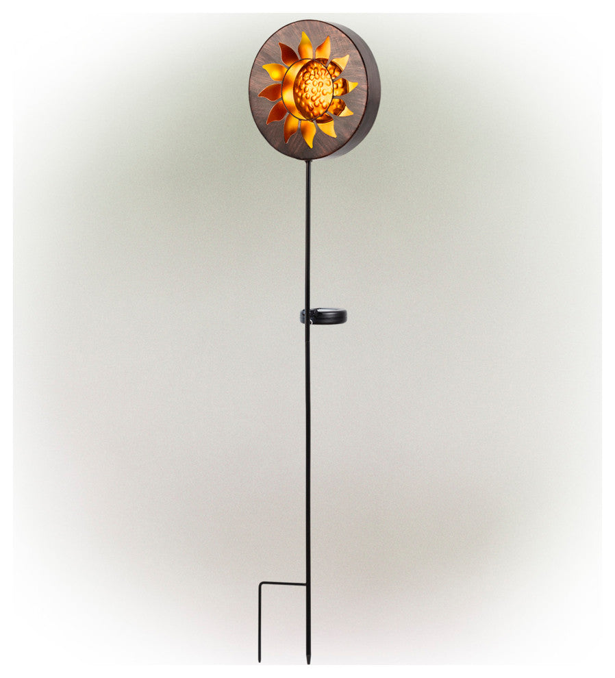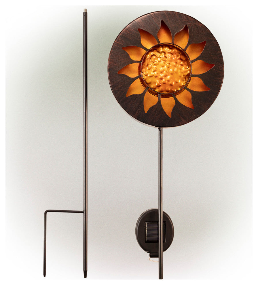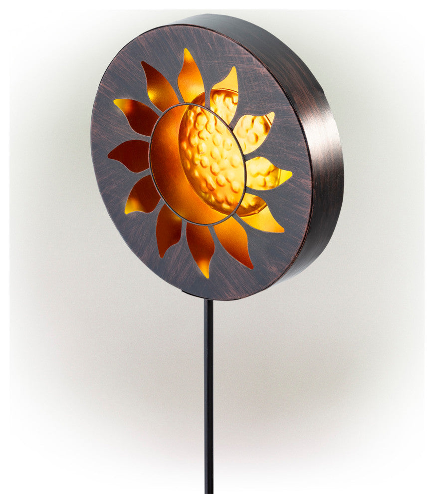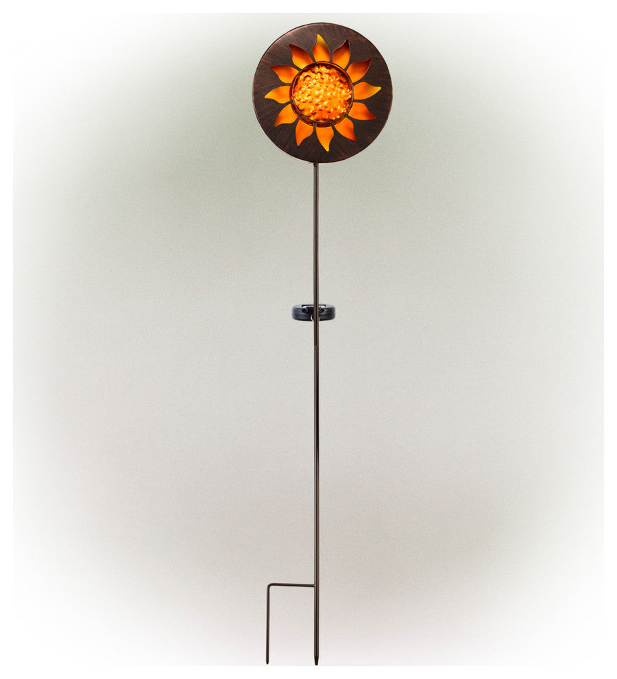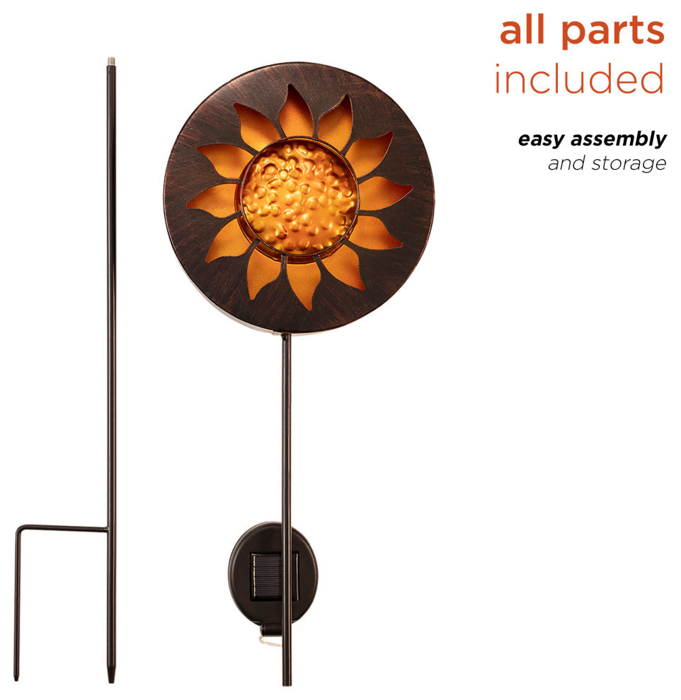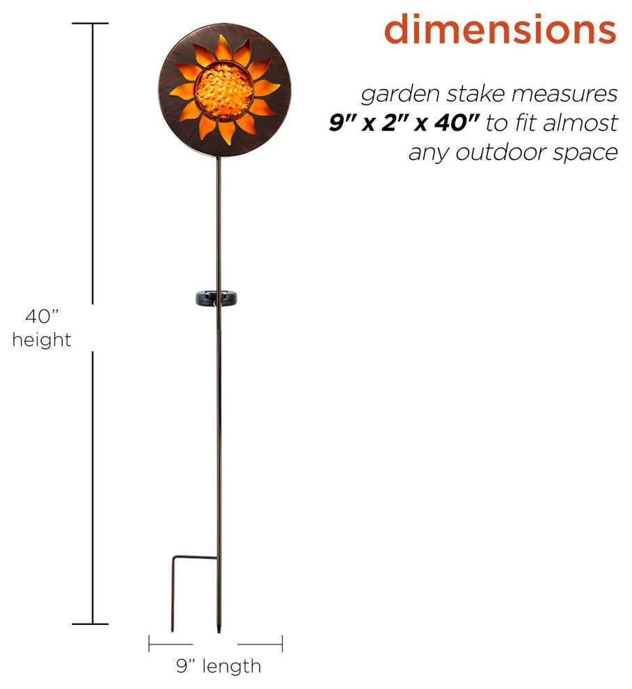 This solar sun garden stake light shines gloriously at night. Powered for up to 8 hours on a full charge from its solar panel. Easily installed in lawns or gardens.