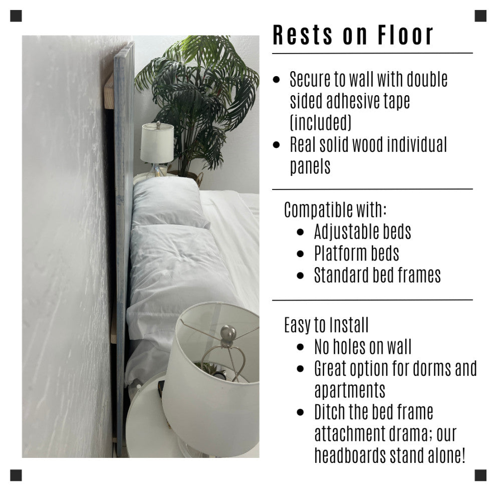 Blue Powderwash Headboard - Queen SizeThis solid wood queen headboard features a rustic bluewash finish with natural wood grain and knot details, creating a warm farmhouse coastal look that complements modern, minimalist, and rustic decor styles.Distinctive Natural Wood Grain.Handcrafted from real wood, each plank showcases unique grain patterns and knots, adding depth and character to the queen headboard. The natural variations make each piece one-of-a-kind, perfect for adding an artisanal, handcrafted touch.Rustic Bluewash Finish for Farmhouse Charm.The Blue Powderwash finish provides a gently distressed look with tonal variations, highlighting the wood"™s natural beauty. This subtle weathered effect adds vintage appeal, ideal for farmhouse, cottage, and coastal-inspired interiors.Freestanding and Versatile Setup.Unlike traditional wall-mounted headboards, this leaner queen size headboard is designed to rest securely against the wall without wall mounting hardware. Its freestanding, leaner style makes it easy to position and adjust, perfect for renters or anyone seeking flexibility. This design also allows it to be used with any bed size, including platform and adjustable frames, making it a stylish and convenient decor option.Perfect Fit for Queen Beds.Measuring 64.5" L x 2" W x 58" H, this queen headboard is crafted to fit seamlessly with standard queen beds. Perfect for master bedrooms, kids bedroom, guest rooms, or creative spaces, it adds a unique, rustic touch to enhance your decor.