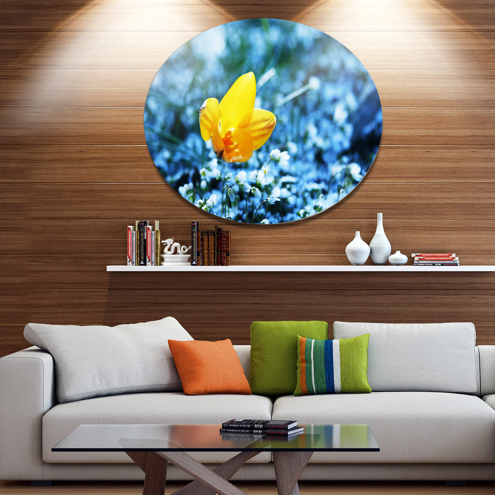 Bring Contemporary Abstraction to your home with this large Circle Metal wall art. This Solitary Yellow Flower on Blue Metal Artwork makes it the focal point of any room or office.