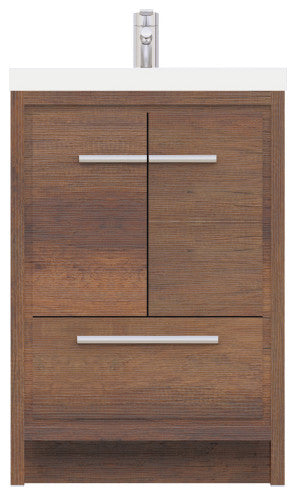 Sortino 24 inch bathroom vanity is a great choice for a small modern bathroom. This free standing vanity offers great storage with a smooth soft-closing, fully functional drawer and two doors. The white rectangular sink completes the simple contemporary design and clean lines brings a touch of modern into your bathroom.