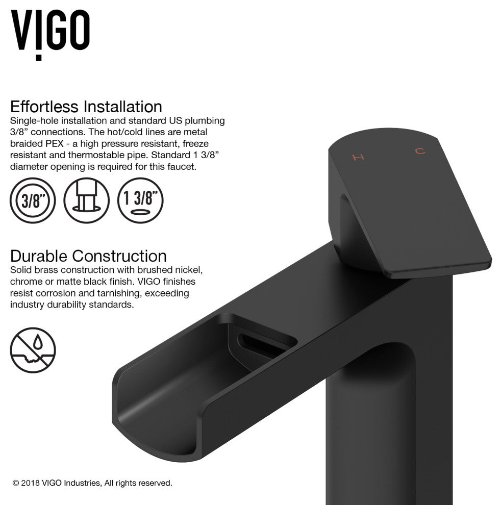 VIGO Vessel sink sets bring state-of-the-art components and style to your modern bathroom of today. Deliberately designed, the VIGO Black Sottile MatteShell Bathroom Sink Set is unique and pristine. Innovative and intense, MatteShell sinks bring the same excellence of classic solid tempered glass and take the construction to the next level. The Black Sottile is deeply opaque and has an eggshell-like sheen that is rich yet subtle. Its deep ebony shade is infused into the sink itself, eliminating the risk of a chipped finish. It has a unique coating to prevent fingerprints and marks, leaving it pristine for years of use. This sink has a bold rectangular shape that brings modernity into any bathroom. It is paired with the VIGO Amada, single-hole, vessel mount bathroom faucet. This easy-to-use faucet is tall without overpowering your space. It has exceptional hardware and is outfitted in a modern matte black finish that resists rust, corrosion and tarnish. The set is made complete with a matching pop-up drain without overflow. Experience the synergy of character and style with this all-in-one bathroom set.