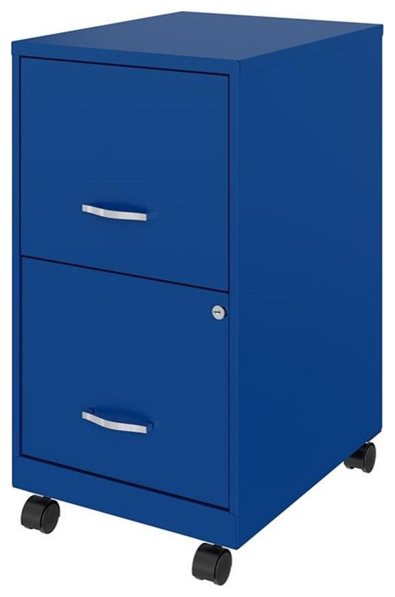 The Mobile 2-Drawer Metal File Cabinet in blue is designed for small office or home office use. The cabinet features a smart, efficient design that works well in small spaces and fits under most work surfaces or desks. Each drawer features high-sides to accommodate letter-sized hanging files. The drawers are also a perfect storage solution for other office essentials. Using a patented glide suspension, the drawers have a smooth open and close slide with a three-quarter drawer extension to prevent tipping. In addition, you can keep your files and possessions secure by using the built-in lock for both drawers. The additional wheels that come with this file cabinet are both stylish and functional which makes it easy to move around your home or office. Painted steel surface is non-porous and easy to clean and sanitize. Bring organization and function to your home or office with this stylish mobile two-drawer file cabinet. Your supplies and files will always be organized and within reach!Features: • Drawers accommodate letter-size hanging file folders • Full high-side drawers provide storage for other office essentials • Smooth patented glide suspension • Cam lock secures both drawers • Three-quarter drawer extension • Tucks under most work surfaces with easy roll casters • Painted steel surface is non-porous and easy to clean and sanitize.Specifications: • Product Dimensions: 26.70" H X 14.25" W X 18.00" D • Product Weight: 20 • Assembly Required: No • Assembly details: To ensure the key for this product does not get loose, slide the thumb latch on left side of handle to the right, at the same time, pull the drawer open. Keys are hanging inside the cabinet by the locking mechanism.