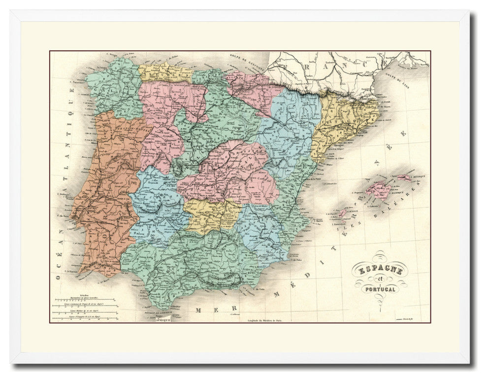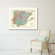Spain Portugal Vintage Old Map Print On Canvas With Picture Frame 28" X 37"
