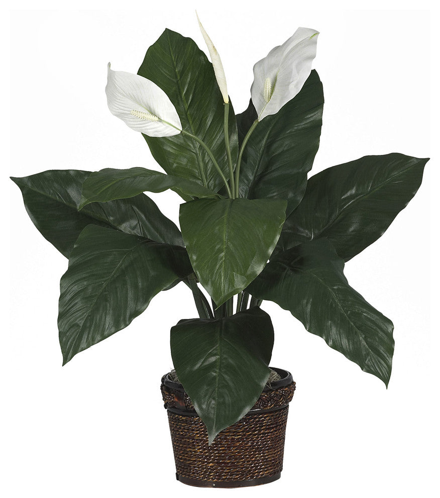 This beautifully designed Spathyfillum adds a touch of glamour and elegance to any space. A trio of delicate flowers bursts forth from inside a setting of bold green leaves. The lush leaves fold gently downward to expose the thin wispy flower stems. Standing 26tall, this lovely plant is housed in a lacquered wicker basket with decorative trim.