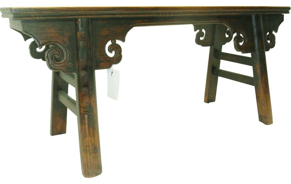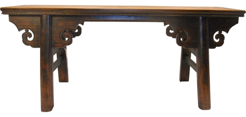 This Chinese antique reproduction has elegant lines with unique details and rich wood grain. This wooden bench is made without nails but made with the ingenuity of wood craftsmen who use age old Chinese wood joinery techniques. This bench is made of solid Elmwood with a rich hand rubbed lacquer patina finish for a protective, water resistant finish that won''t water mark. The top piece of wood is reclaimed lumber with a slight distressed finish. This style bench is used in China as a bench in schools and -martial art studios there for its name. Use in the bedroom in front of a bed to hang a quilt on, or use in the living room as a coffee table, in front of a window as a plant stand or as a bench in the entry way. A deep medium brown finish will be a warm light tone that would add life to any interior.• 42.5 x 14 x 18.5 H• Top is 42.5 x 7.75" Wide-Reclaimed lumber• Solid elm wood, Natural lac finish• Medium brown walnut stain• Solid wood furniture no assembly• Expertly shipped and insured