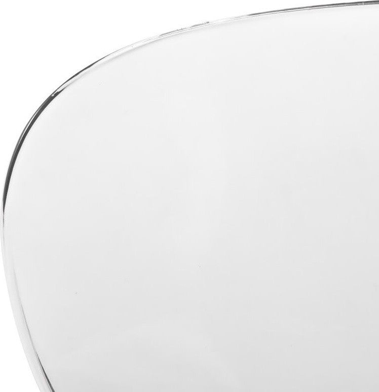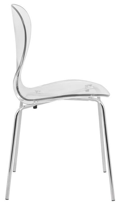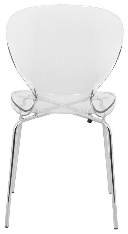 Item Specifications:.The dining chair features a curved backrest that supports the spine"™s natural curve and a rounded seat edge with a smooth, sloping front that reduces pressure on the thighs. This design makes it comfortable for long sitting in dining rooms, kitchens, or offices..The kitchen chair has an X-shaped frame underneath the seat that provides secure and stable support by evenly distributing weight. It has stainless steel legs with a chrome finish for durability and modern style, each with a diameter of 0.7 inches. The chair supports a weight capacity of up to 275 pounds, ensuring it is reliable for everyday use..The seat and backrest are made from high-quality PC plastic. This durable and impact-resistant material ensures the side chair retains its shape and appearance over time. The transparent design creates a sense of openness in the room by allowing light to pass through, contributing to a more airy and spacious feel..This dining chair weighs 10.2 pounds, making it lightweight and easy to move. Its stackable design allows you to save space by stacking multiple chairs when not in use, ideal for both small and large spaces..The chair is UV-resistant, which protects it from fading and discoloration caused by prolonged exposure to sunlight. This feature ensures the accent chair maintains its color and appearance over time..The dining room chair has plastic glides on the bottom of each leg, which protect your floors from scratches and scuffs. These glides help the chair move smoothly and quietly on different surfaces, keeping your flooring in good condition..Assembly is straightforward with all necessary tools and instructions included. The chair features screws beneath the seat for a secure attachment to the frame, enhancing its stability and durability. The smooth surfaces are easy to clean with a dry or damp cloth, ensuring the chair remains in good condition with minimal effort.Item Dimensions:.Overall: 32.25 inches high x 17 inches wide x 16.25 inches deep.Seat: 17.5 inches high x 16.125 inches wide x 15.5 inches deep.Backrest height: 14.75 inches high.Weight: 10.2 lbs.Item Description:Enhance your dining area with our Oyster Dining Chair, meticulously designed to offer both style and comfort. This versatile chair features a sleek, transparent molded plastic seat and backrest that seamlessly complement any interior decor. The ergonomic curved backrest and waterfall edge seat ensure lasting comfort and proper posture support, making it perfect for extended use in dining rooms, kitchens, or offices. The chair"™s stability is reinforced by a sturdy X-shaped frame and stainless steel legs with a chrome finish, supporting up to 275 lbs. This lightweight, stackable chair is not only easy to move and store but also UV resistant, ensuring long-lasting durability even in sunlit spaces. Assembly is required, but the straightforward process makes it a hassle-free addition to your home or office.