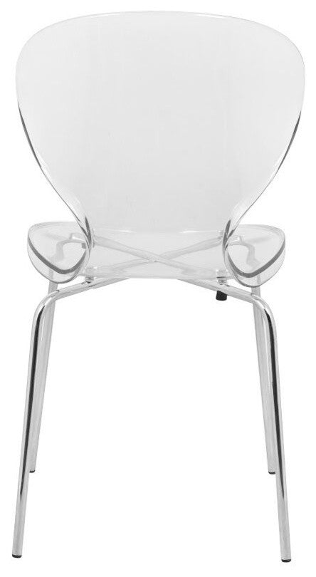Item Specifications:.The dining chair features a curved backrest that supports the spine"™s natural curve and a rounded seat edge with a smooth, sloping front that reduces pressure on the thighs. This design makes it comfortable for long sitting in dining rooms, kitchens, or offices..The kitchen chair has an X-shaped frame underneath the seat that provides secure and stable support by evenly distributing weight. It has stainless steel legs with a chrome finish for durability and modern style, each with a diameter of 0.7 inches. The chair supports a weight capacity of up to 275 pounds, ensuring it is reliable for everyday use..The seat and backrest are made from high-quality PC plastic. This durable and impact-resistant material ensures the side chair retains its shape and appearance over time. The transparent design creates a sense of openness in the room by allowing light to pass through, contributing to a more airy and spacious feel..This dining chair weighs 10.2 pounds, making it lightweight and easy to move. Its stackable design allows you to save space by stacking multiple chairs when not in use, ideal for both small and large spaces..The chair is UV-resistant, which protects it from fading and discoloration caused by prolonged exposure to sunlight. This feature ensures the accent chair maintains its color and appearance over time..The dining room chair has plastic glides on the bottom of each leg, which protect your floors from scratches and scuffs. These glides help the chair move smoothly and quietly on different surfaces, keeping your flooring in good condition..Assembly is straightforward with all necessary tools and instructions included. The chair features screws beneath the seat for a secure attachment to the frame, enhancing its stability and durability. The smooth surfaces are easy to clean with a dry or damp cloth, ensuring the chair remains in good condition with minimal effort.Item Dimensions:.Overall: 32.25 inches high x 17 inches wide x 16.25 inches deep.Seat: 17.5 inches high x 16.125 inches wide x 15.5 inches deep.Backrest height: 14.75 inches high.Weight: 10.2 lbs.Item Description:Enhance your dining area with our Oyster Dining Chair, meticulously designed to offer both style and comfort. This versatile chair features a sleek, transparent molded plastic seat and backrest that seamlessly complement any interior decor. The ergonomic curved backrest and waterfall edge seat ensure lasting comfort and proper posture support, making it perfect for extended use in dining rooms, kitchens, or offices. The chair"™s stability is reinforced by a sturdy X-shaped frame and stainless steel legs with a chrome finish, supporting up to 275 lbs. This lightweight, stackable chair is not only easy to move and store but also UV resistant, ensuring long-lasting durability even in sunlit spaces. Assembly is required, but the straightforward process makes it a hassle-free addition to your home or office.