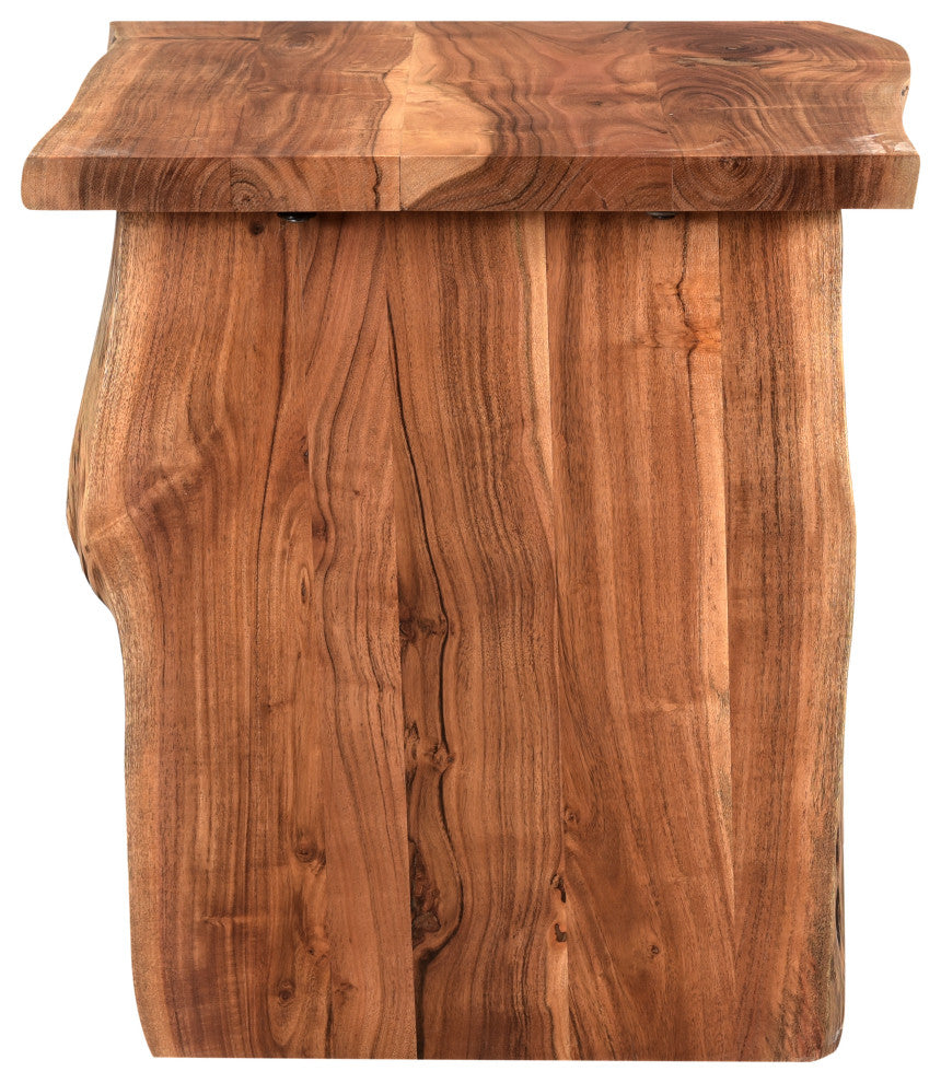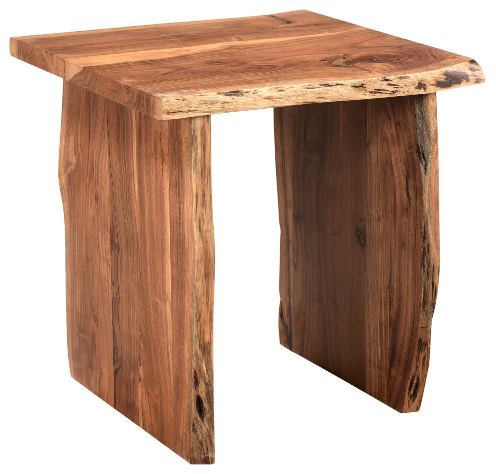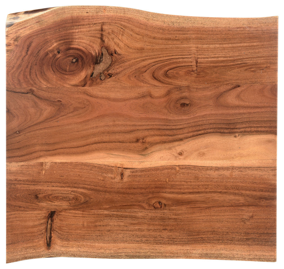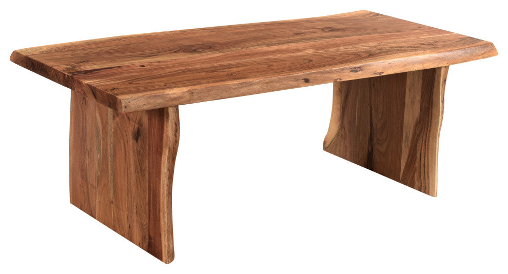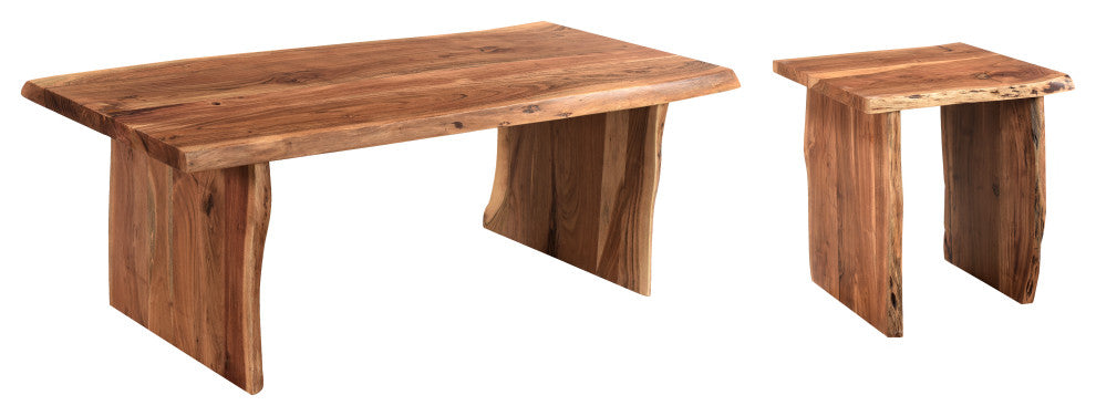 Infused with warmth, this coffee table set seamlessly blends live edge wood movement with a natural finish. Consisting of a coffee table and an end table with a minimalist design, it enhances the open and airy atmosphere of your home. Handcrafted from solid acacia, each piece guarantees enduring quality and rustic charm.