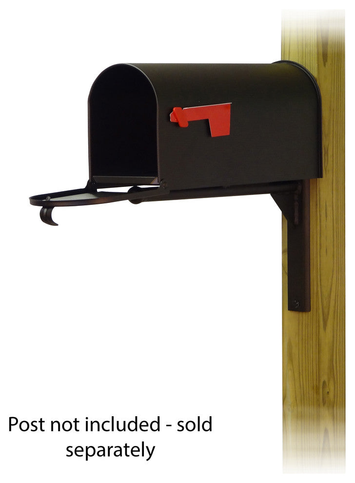 The Standard Upscale Mailbox and Ashley mounting bracket combination presents a upscale option for the typical wood post curbside mailbox. This heavy-duty galvanized steel mailbox has a durable ribbed body for extra strength and features a rust resistant powder coat finish for lasting durability and stylish curb appeal. The Ashley mounting bracket brings a simplistic, contemporary look to your mailbox. Mailbox and mailbox mounting bracket included. This set does NOT include a post as it is intended to be mounted on an existing wood post or solid surface, or a new wood post that can be purchased separately. Mounting hardware is included.
