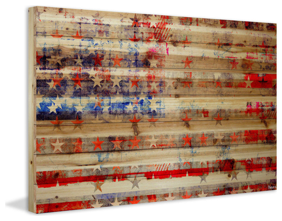 Striking and unique, the "Stars and Stripes" Print on Natural Pine Wood by Parvez Taj will bring your walls to life. Printed on natural pine wood, this 45 inch wide by 30 inch tall contemporary artwork will make a statement in any living room, dining room, or bedroom.- Fine art print on natural pine by Parvez Taj- wood pieces are hand-selected by Fine craftsmen for printing- Arrives ready to hang- Includes a certificate of authenticity- Artist signature on the front