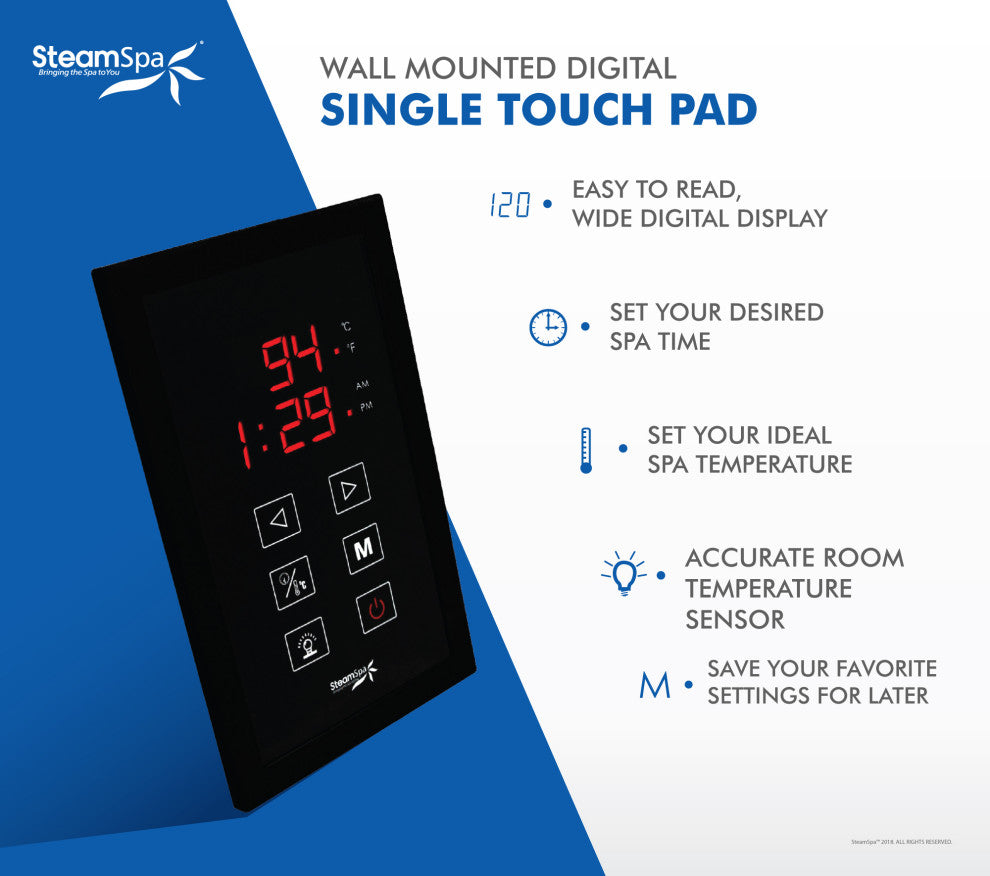 The perfect steam sauna experience is exactly what we had in mind with SteamSpa steam generator packages. Easy to install and even easier to operate these steam generators produce a consistent flow of soft and soothing steam thanks to the cleverly designed dual tank technology while minimizing any distracting operational noises. All in all you get a safe, quite, reliable, luxurious steam sauna experience with our compact powerhouse of a steam generator. �Includes a 12kW QuickStart Acu-Steam Bath Generator, Touch Pad Control Panel, Two Steamheads, Pressure Relief Valve, and FREE Bottle of Aroma Scented Oil