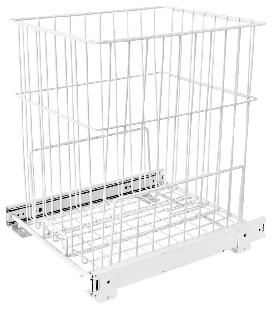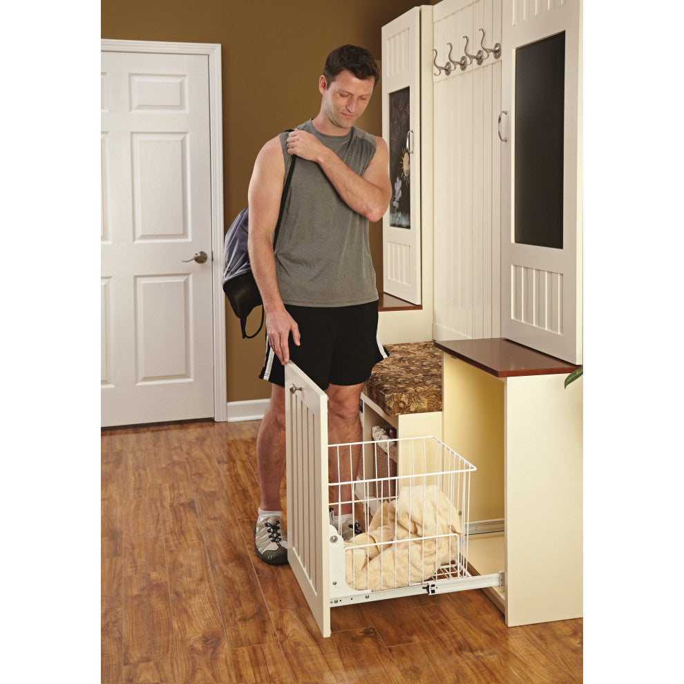 Another option for storing dirty clothes. The Pullout Wire Hamper is available in four sizes and is easily removable for carrying to the laundry room. The HRV Series features full-extension slides and easy installation with just four screws.-Included: (1) White wire hamper with metal frame and mounting hardware-Slide Type: 100lb Full-Extension Ball-Bearing Slides-2.3 Bushel Wire Hamper-Shorter depth is perfect for a laundry room or bathroom vanity cabinet-Designed for a cabinet opening of 14-1/2" to 18"-Door Mount Brackets: Option that is sold separately (RV DM KIT)-Construction: Heavy gauge painted metal wire construction-Mounts to cabinet floor-Limited Lifetime Warranty