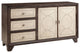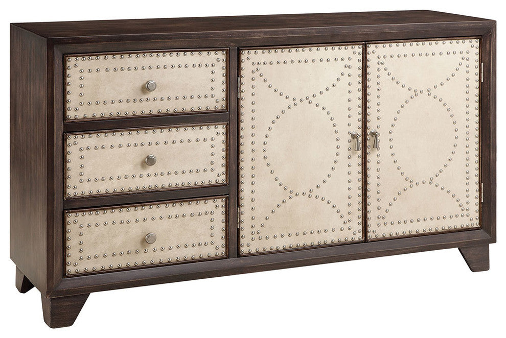 Two-door, three-drawer accent cabinet with one fixed shelf and wire management on back panel. Hand-painted brown finish with cream upholstered front panels accenting brass nailheads. Additional Product Information: Item Height (in.): 34.38 Item Width (in.): 17 Item Length (in.): 60 Bulb Included?: No Collection: Colette Item Finish: Hand-Painted,Brown,Cream Item Materials: MDF,Solid Wood County of Origin: China