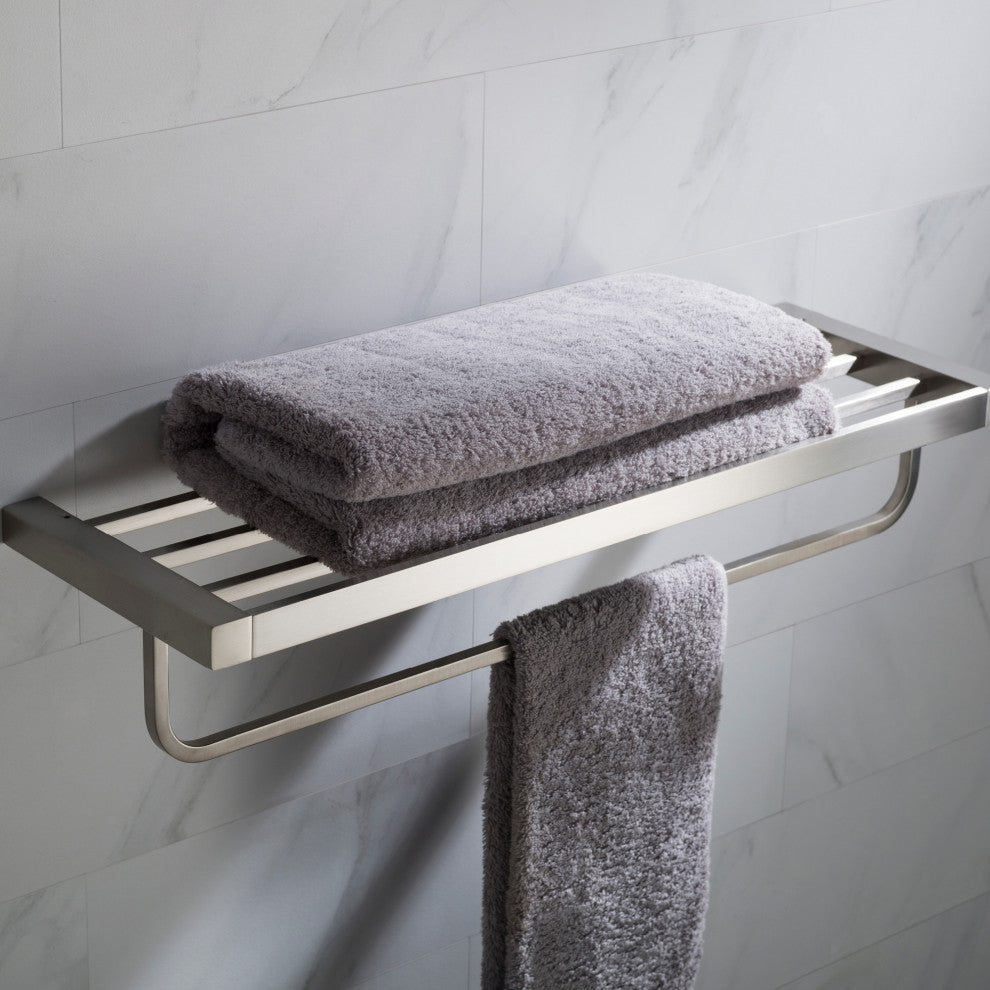 The Stelios bathroom accessory collection features geometric forms with tight angles that add a contemporary edge to any bathroom decor. Solid brass construction offers maximum durability, with a range of finish options for a customized look.• Model: KEA-19942BN• Product: Bathroom Shelf with Towel Bar• Collection: Stelios • Material: Solid Brass• Color/Finish: Brushed Nickel• Corrosion Resistant finish• Bathroom Shelf with built-in bar for towels and washcloths• Installation-Ready: Comes in one piece with no assembly required, installation template and all mounting hardware included• Modern Bathroom Style: Streamlined design with concealed screws and rounded edges to avoid scratching• Dimensions: 24 5/8" L x 4 9/16" W x 7 7/8" H; Holds up to 22 lbs.• Limited Lifetime Warranty