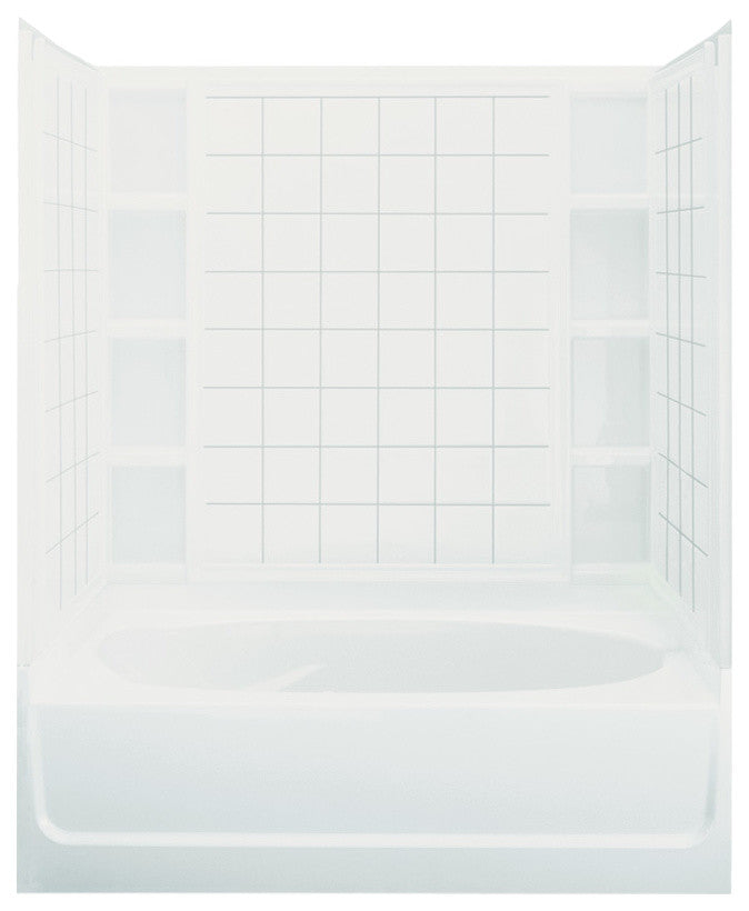 Realistic tile wall surround features molded-in shelves for generous storage space
