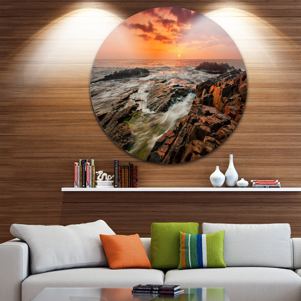 Bring Contemporary Abstraction to your home with this large Circle Metal wall art. This Stormy Waves Rushing Into Rocks Metal Artwork makes it the focal point of any room or office.