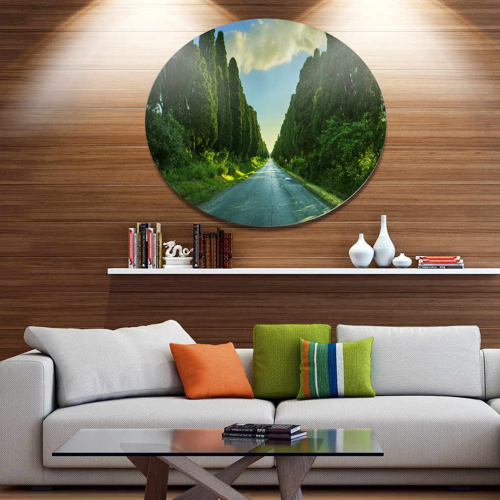 Straight Cypress Trees Boulevard, Landscape Round Metal Wall Art, 11"