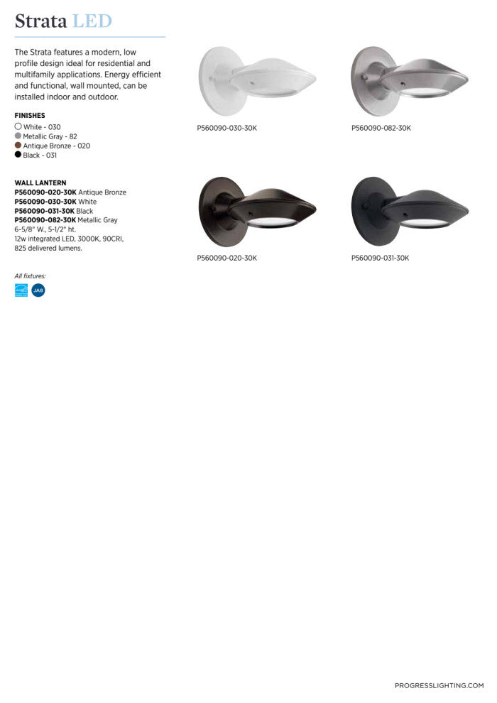 A combination of modern decorative styling with state-of-the-art LED technology, the Strata Collection fixture represent the latest in energy efficient technology for residential illumination. Using only 12-Watts and with a rated lamp life of over 50,000 hours, this fixture offer a look at the future of lighting. Compare illumination level to a 60-Watt incandescent fixture. Low-profile modern housing projects light downwards to create glare-free dark sky friendly illumination. Uses (1) 12-watt LED bulb (included).