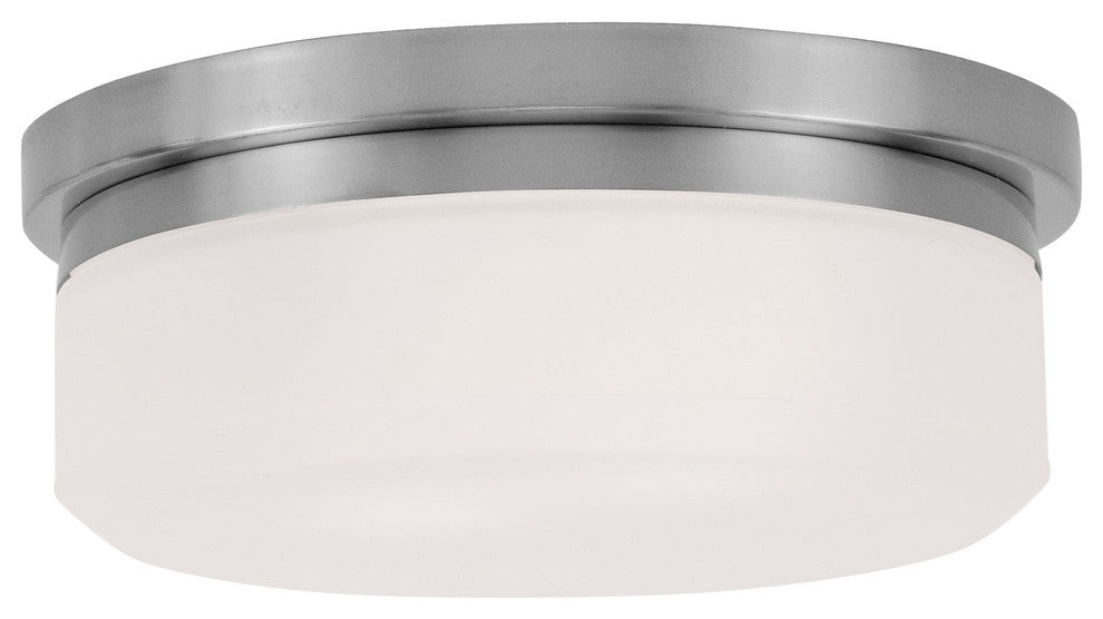 This flush mount from the Stratus collection offers bright lighting in a simple, unadorned style. Rounded hand blown satin opal white glass seems to float over a brushed nickel frame.