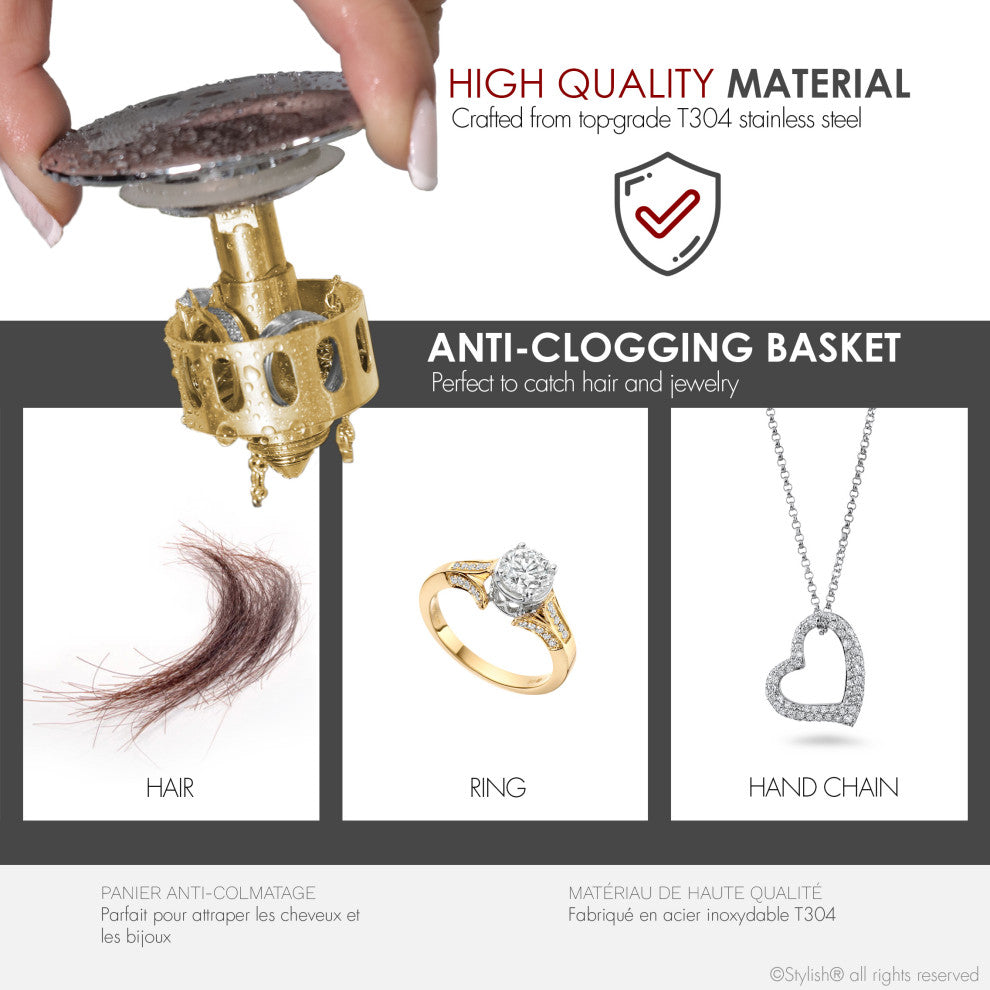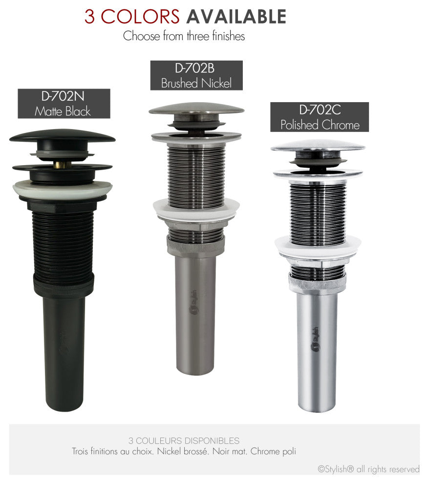 Upgrade your bathroom with our improved Mushroom Style Pop-Up Drain without overflow. It''s a perfect mix of style and strength. This drain is made from top-quality T304 stainless steel, adding both quality and style to your bathroom. Its smart design is user-friendly, with a simple press-to-close and press-to-open mechanism for easy operation. This pop-up drain is designed to prevent clogs from hair, soap scum, and even small items like jewelry, keeping your sink free from blockages.FEATURES:VERSATILE COMPATIBILITY: Fits sink holes 1 ½"? to 1 ¾"? in diameter and ¾" to 2" thickness.BUILT-IN FILTER BASKET: The integrated filter basket efficiently traps debris, preventing clogs, and safeguards dropped valuables from going down the drain.BUILT TO LAST: Exceeds 25,000 open-close cycle standard, designed to last 30+ years.BEAUTIFUL FINISHES: Choose from Brushed Nickel, Matte Black or Polished Chrome.PERFECT FIT: Suitable for sinks without overflow holes.EASY MAINTENANCE: Simple cleaning and disassembly, with included rubber sealing rings.CERTIFIED QUALITY: cUPC certified for North American plumbing standards.WARRANTY: This product is covered by one-year warranty.