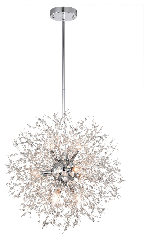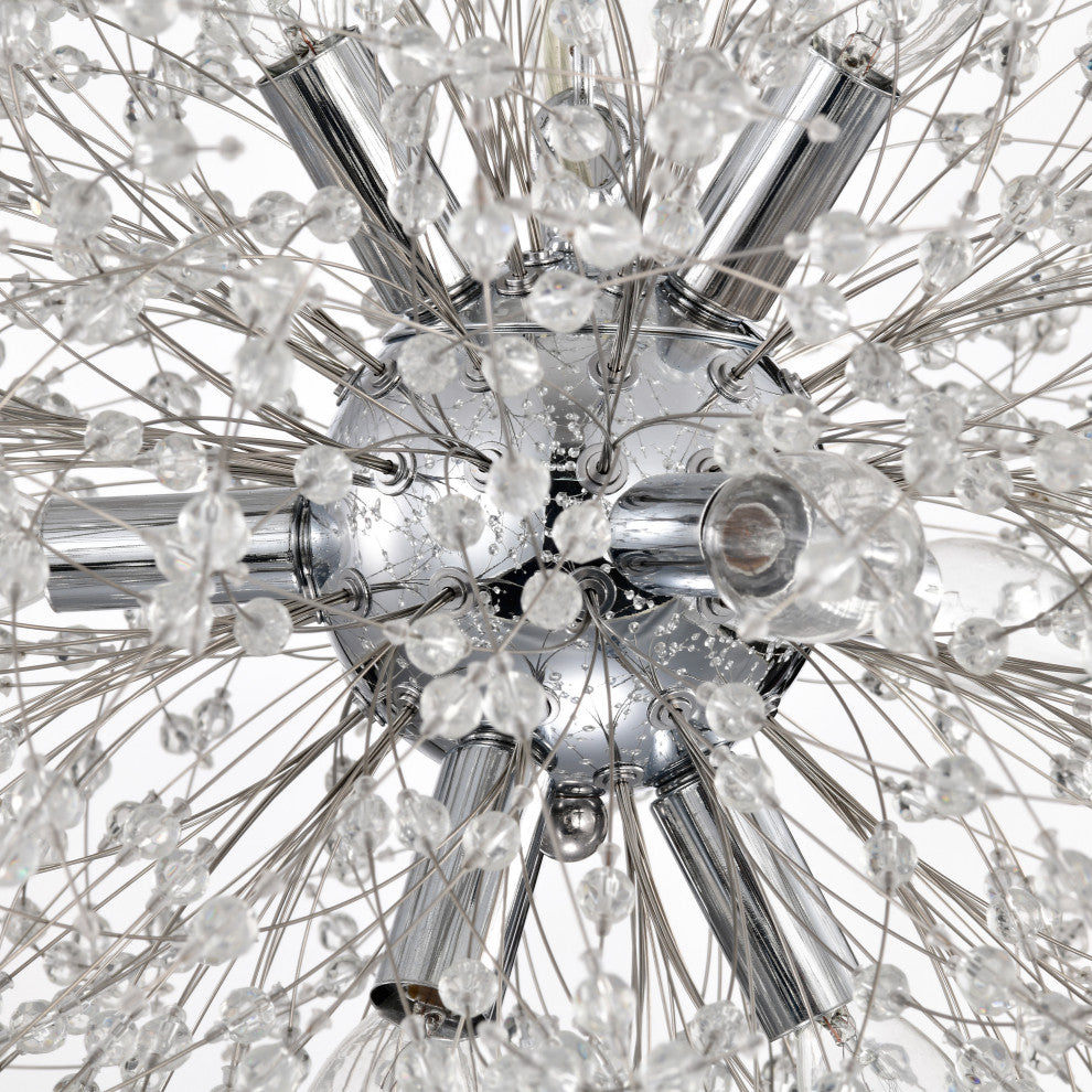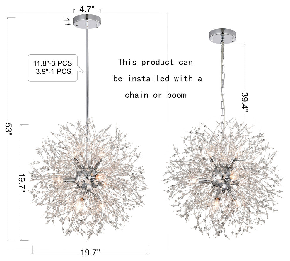 • Number of Lights: 9 • Primary material: Iron, Glass • Power Source: Hardwired • Finish: Chrome • Fixture Shape: Sputnik • For Dining Room, Living Room, Bedroom, Foyer, Office • UL Listed • Dimmable: Yes with Dimmable Switch and Bulbs • Light Direction: Multi • Assemble Required: Yes • Bulb Base: E12 • Bulb Included: No • Hanging Option: Chain or Rods • Voltage: 110V • Maximum Wattage: 60 • Fixture Dimension: 19.7"W X 19.7"D X 19.7"H • Overall Hanging Length: 53" • Chain Length: 39.4" • Rod Length: 3.9" • Number of Rods: 3 • Overall Weight: 7lb