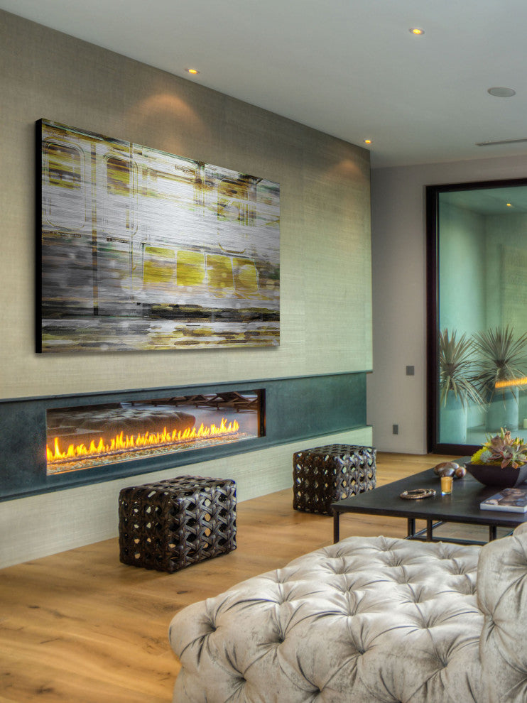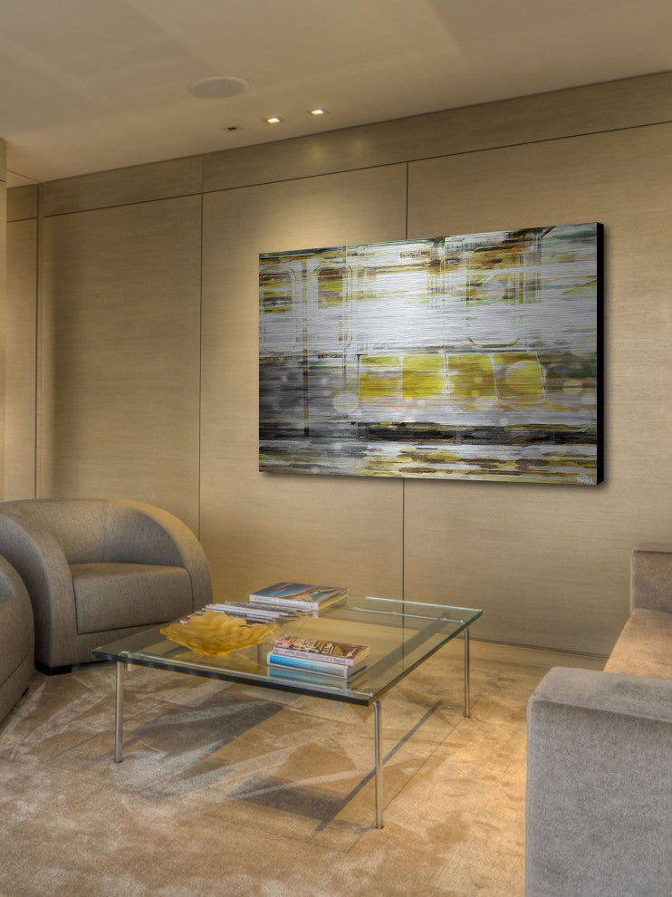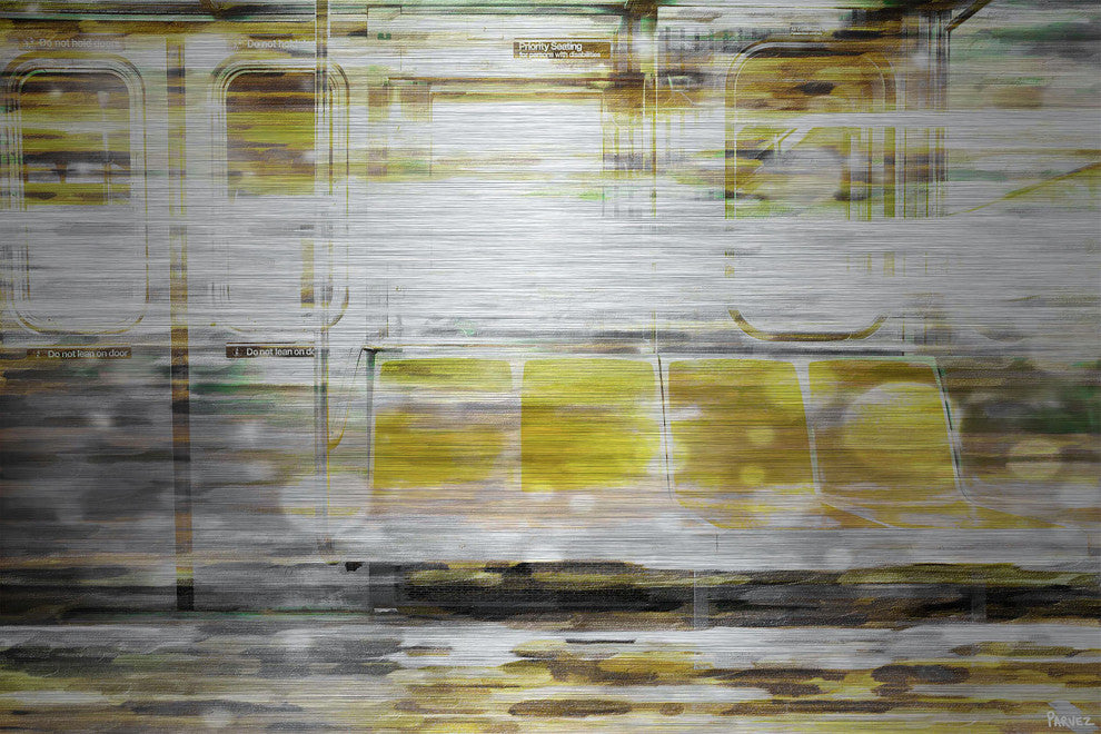 Striking and unique, the "Subway Seats" Print on Brushed Aluminum by Parvez Taj will bring your walls to life. Printed on aluminum, this 60 inch wide by 40 inch tall contemporary artwork will make a statement in any living room, dining room, or bedroom.- Fine art UV ink print on brushed aluminum by Parvez Taj- The aluminum pops the colors and creates an iridescent shimmer, which gives depth to a room- Arrives ready to hang - Includes a certificate of authenticity- Artist signature on the front