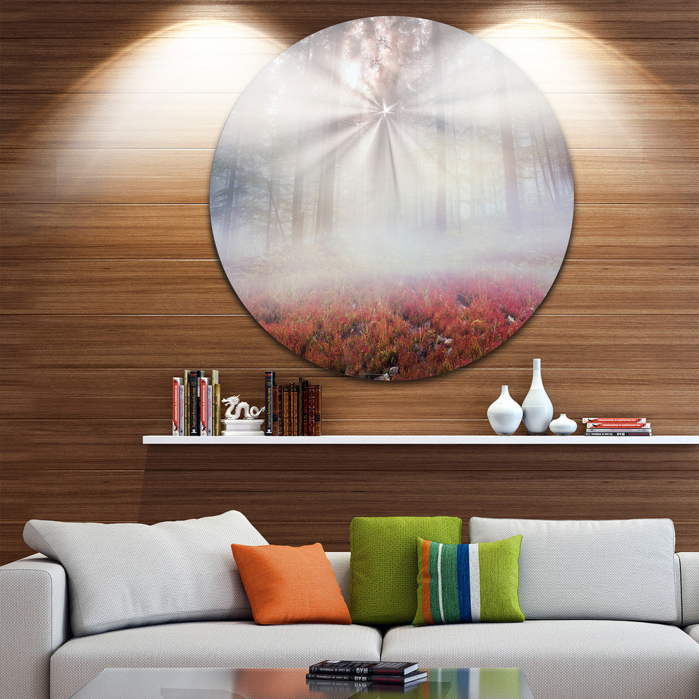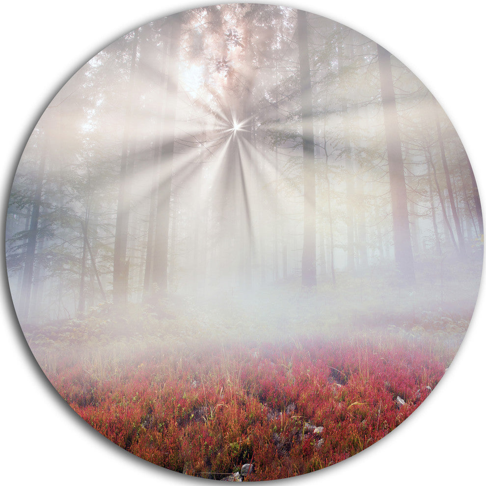 Bring Contemporary Abstraction to your home with this large Circle Metal wall art. This Sun Rays Illuminating Foggy Forest Metal Artwork makes it the focal point of any room or office.
