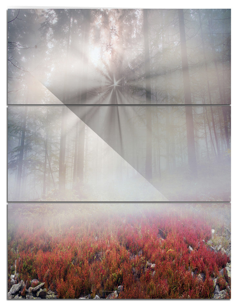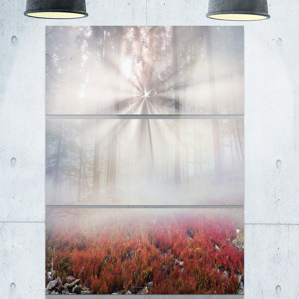 "Sun Rays Illuminating Foggy Forest" Photo Metal Wall Art, 3 Panels, 28"x36"