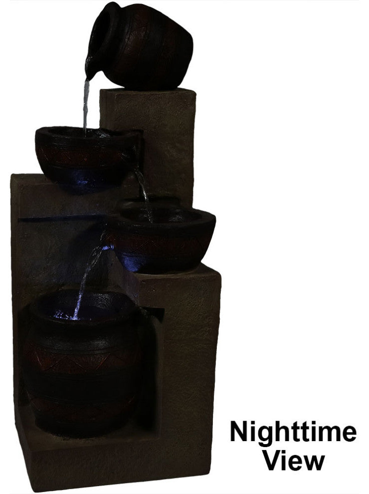 Bring relaxation and serenity to any outdoor space with a new solar power water fountain. This feature is constructed with a sturdy polystone material that is designed to look like four pouring bowls. Watch as the water softly flows from the top all the way down to the bottom bowl where it then recirculates back through with help from a solar pump. Simply assemble, fill, and enjoy the ambiance and relaxation that it will bring. If fully charged, the batteries will power up to 4 hours. When the batteries are depleted, the system will automatically switch to be powered by the solar panel, and will resume running when the sun comes out.