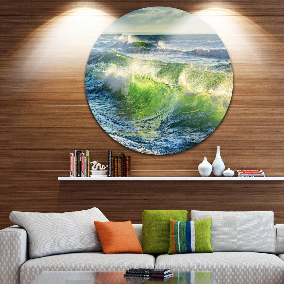 Bring Contemporary Abstraction to your home with this large Circle Metal wall art. This Sunrise and Shining Waves in Ocean Metal Artwork makes it the focal point of any room or office.