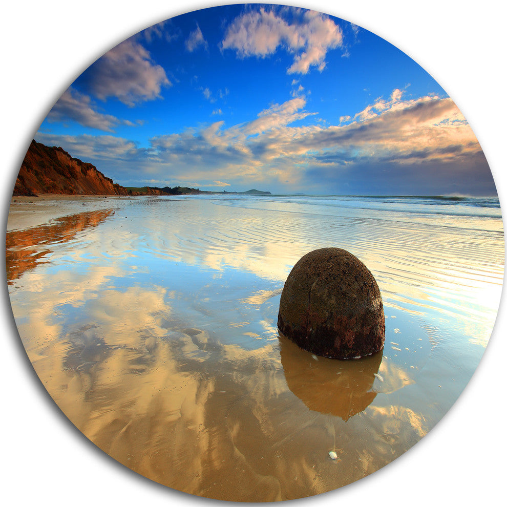 Bring Contemporary Abstraction to your home with this large Circle Metal wall art. This Sunrise at Moeraki Boulders Metal Artwork makes it the focal point of any room or office.