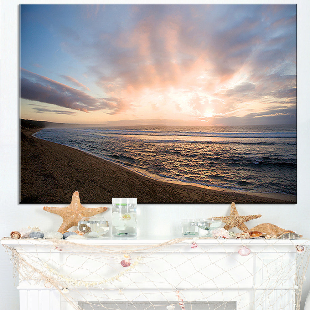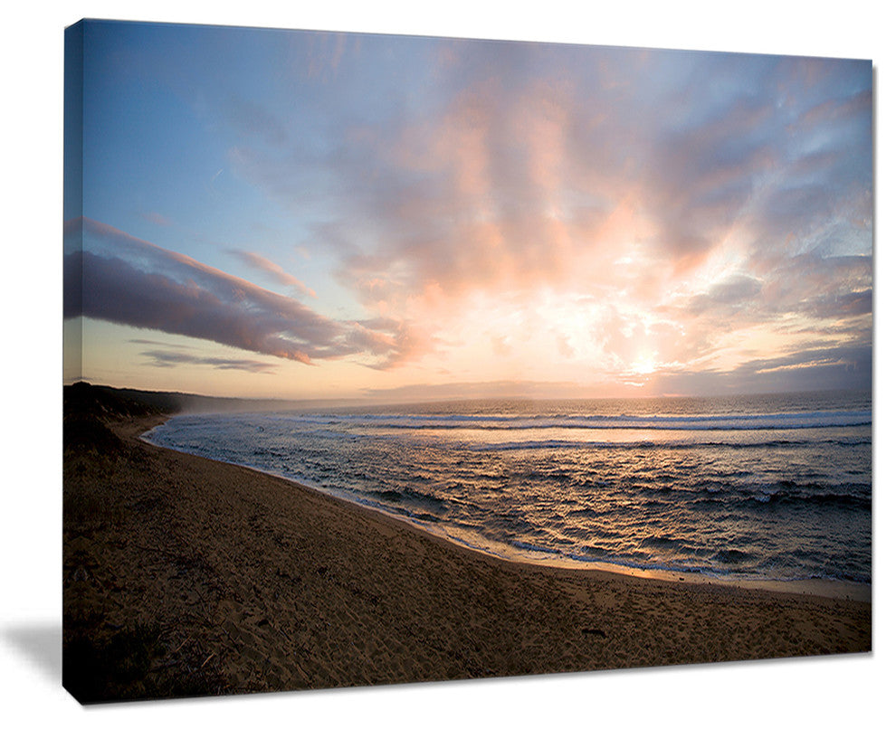 The Sunrise over Indian Ocean Waters canvas art print is sure to make an impression on anyone who sees it. This artwork is gallery wrapped around a 1-inch solid wood frame and arrives carefully packaged and entirely ready to hang on the wall. Design Art only uses the highest resolution and pigments to ensure a crisp colorful print that is never faded or pixelated. This artwork is sure to be a conversation starter in any home or office.