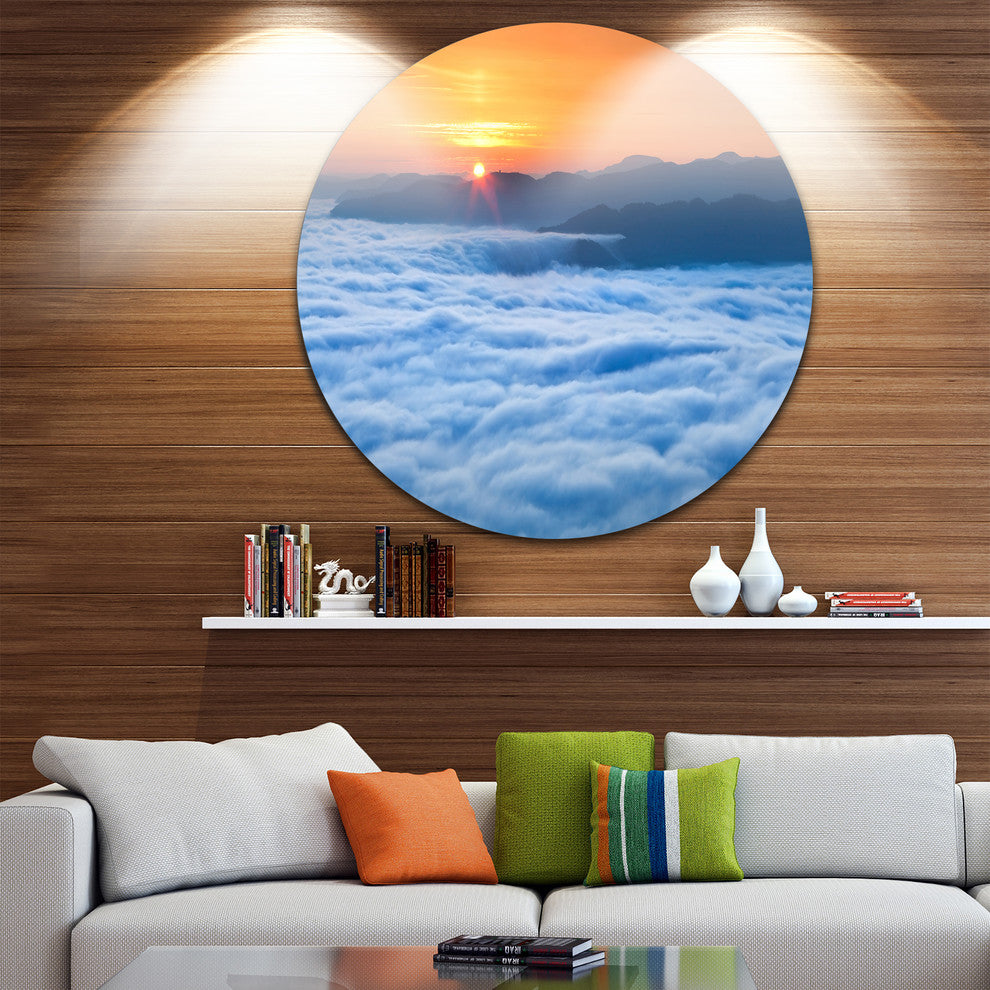 Bring Contemporary Abstraction to your home with this large Circle Metal wall art. This Sunrise Over Misty Sea Waters Metal Artwork makes it the focal point of any room or office.