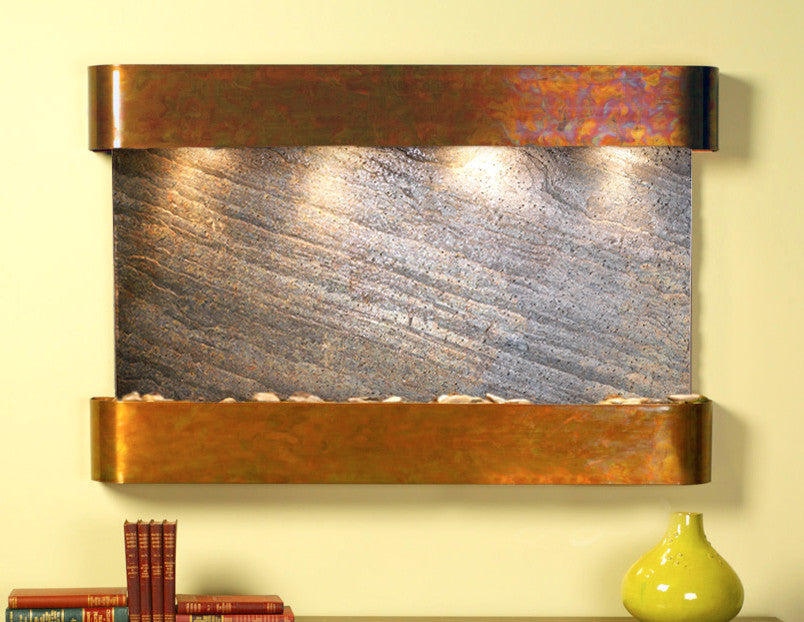The Sunrise Springs water fountain by Adagio Water Features is perfect for over a sofa, table, potted plants, or desk. The soothing sounds it creates will help relax you after a long day at work or play. Flowing water calms all who hear it from the very young to the young at heart. Simple assembly and maintenance makes this wall fountain perfect for any home.52" L x 35" H x 6" D, easy to hang, complete with colored instructions and hardware for hanging on a sheetrock wall. Hanging Weight 100 lbs. This unit includes: 4 halogen lights Polished river rocks Electric pump 3-way pull chain that allows you to run just lights, just water, or lights and water. Welded plastic liner insures against leaking and unique water distribution unit system will not clog. 110V, 100W; one cord operates entire unit; 90 degree plug can be concealed behind water feature. Durable powder coat finish; Manufactured and assembled in the USA with a 1 year limited warranty. • This light-weight slate veneer known as FeatherStone is natural stone and therefore may differ in color and texture from the photos shown.