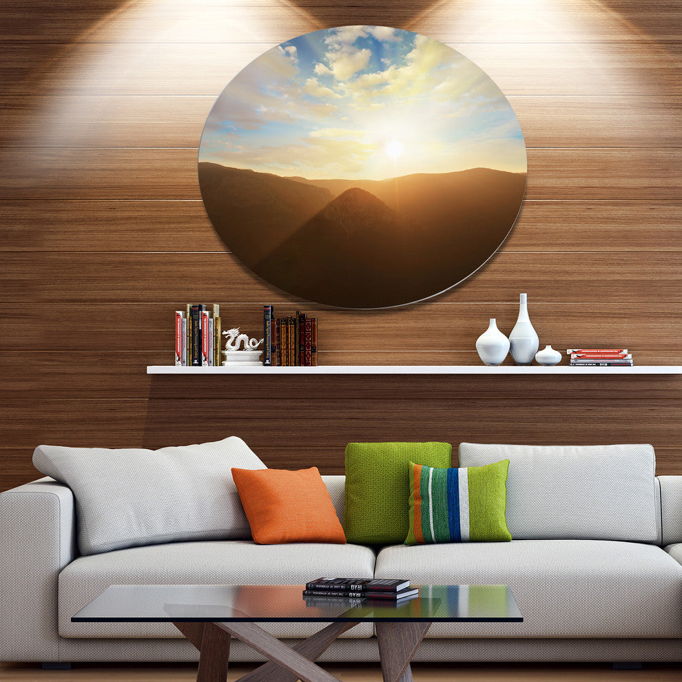 Bring Contemporary Abstraction to your home with this large Circle Metal wall art. This Sunset over Gloomy Mountains Metal Artwork makes it the focal point of any room or office.