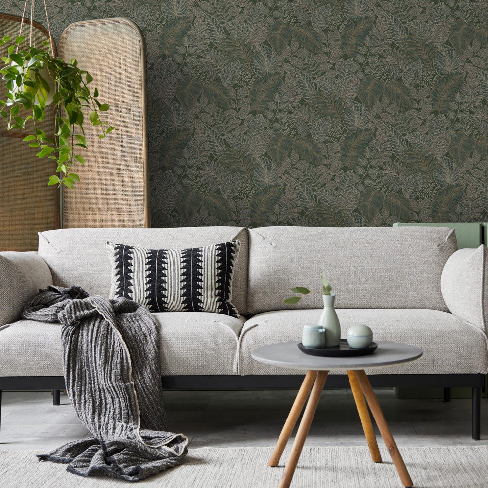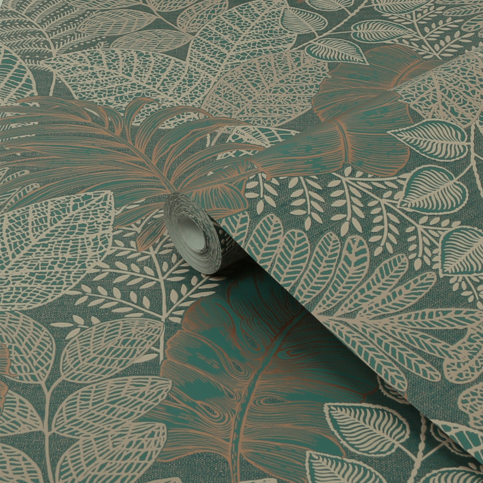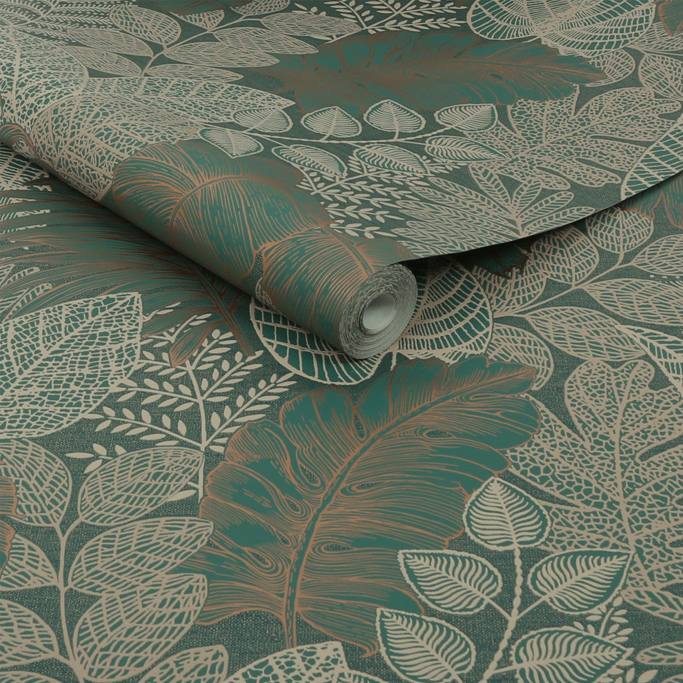 Scattered Leaves Forest Green is an intricate wallpaper with a silhouetted detailed design, with a decadent copper detailing this will suit any room in your home.