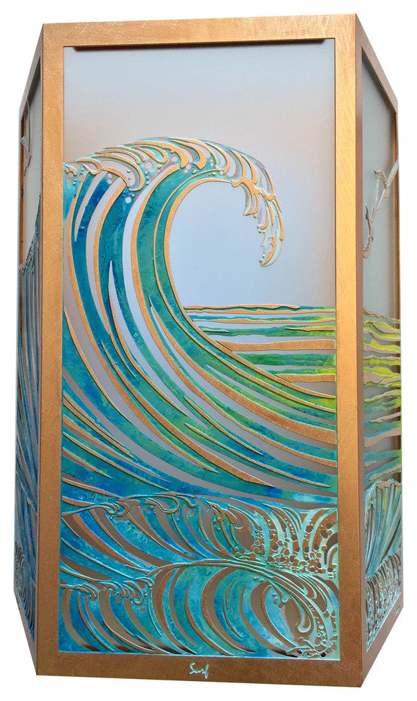 He''e Nalu means big wave in Hawaiian. The Surf Sconce is made in Hawaii by artist Leighton Lam. A lifelong surfer, Leighton''s original artwork for this sconce is inspired by his many surf adventures. The sconce is made of solid copper with Japanese high-strength etched glass. The patina finish is hand painted with a green verdigris (patina) detailing. All lighting comes with a lamp holder and cover. Paradise Lights come complete, ready for easy installation. They can be used as interior or exterior wall mounted fixtures, all you need is an electrical line to connect with in your wall, on existing homes would be any wall mounted light, on a new construction be sure your architect / electrician plan for a power line to the area you want your lights. The lamp holder will take a standard bulb 40-120 watts.
