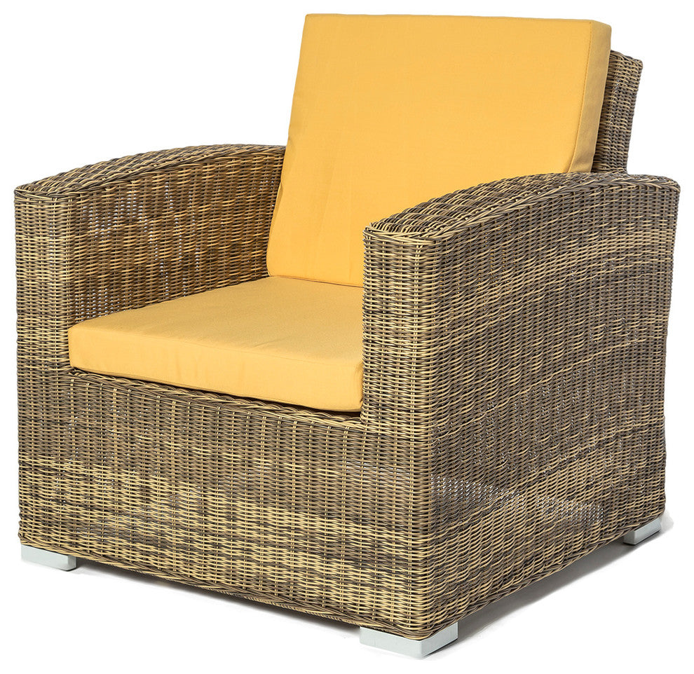 Consider bringing the warmth of the Pacific Islands to your home with this cozy wicker conversation set. Enjoy comfortable deep seating with high backrests and plush cushions. Brighten up your living area with the warmth of rich light brown wicker and yellow cushions. Yet there is more than meets the eye, this sofa set is made with 100% weather resistant resin wicker and is reinforced with a corrosion resistant powder coated aluminum frame. Redefine your indoor or outdoor living area with unbeatable comfort and quality.