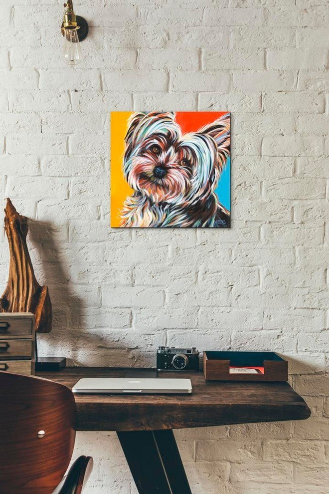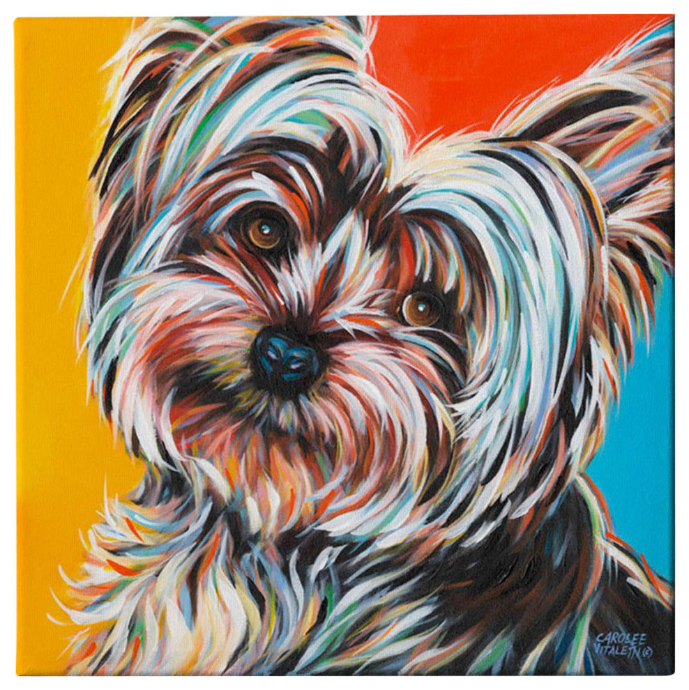 Sweet Yorkie II'' by Carolee Vitaletti. Carolee Vitaletti grew up in upstate New York where she graduated from Rochester Institute of Technology, with a Bachelors of Fine Art (BFA) in Graphic Design. Now residing in Williamsburg, Virginia, Carolee is commissioned by numerous people and business for custom murals and canvas paintings for their private collections. Her art shows creativity, design ability, love of nature and animals, bright colors and layers of textures. Dimensions: 12"W x 0.75"L x 12"H