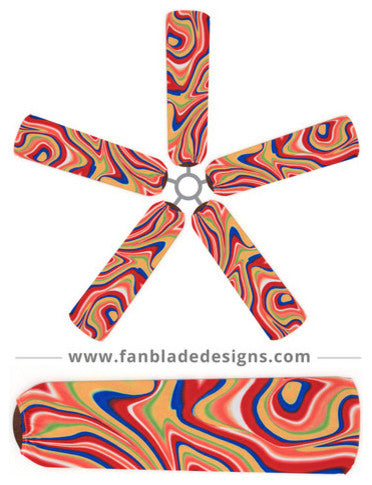 In a category all their own, our Swirling Rainbow fan blade covers will delight the kids'' with their swirling patterns and bright colors. A blast from the past, these totally groovy Fan Blade Designs are a thoroughly modern approach to keeping your ceiling fan clean. Constructed from a quality, lightweight blend of polyester-spandex. Fan Blade Designs are machine washable ceiling fan blade covers created to keep ceiling fans clean and colorful. Sold as a set of five, these lightweight slip covers for ceiling fans come in more than 70 designs and two distinct decor lines, and are all made in the USA.