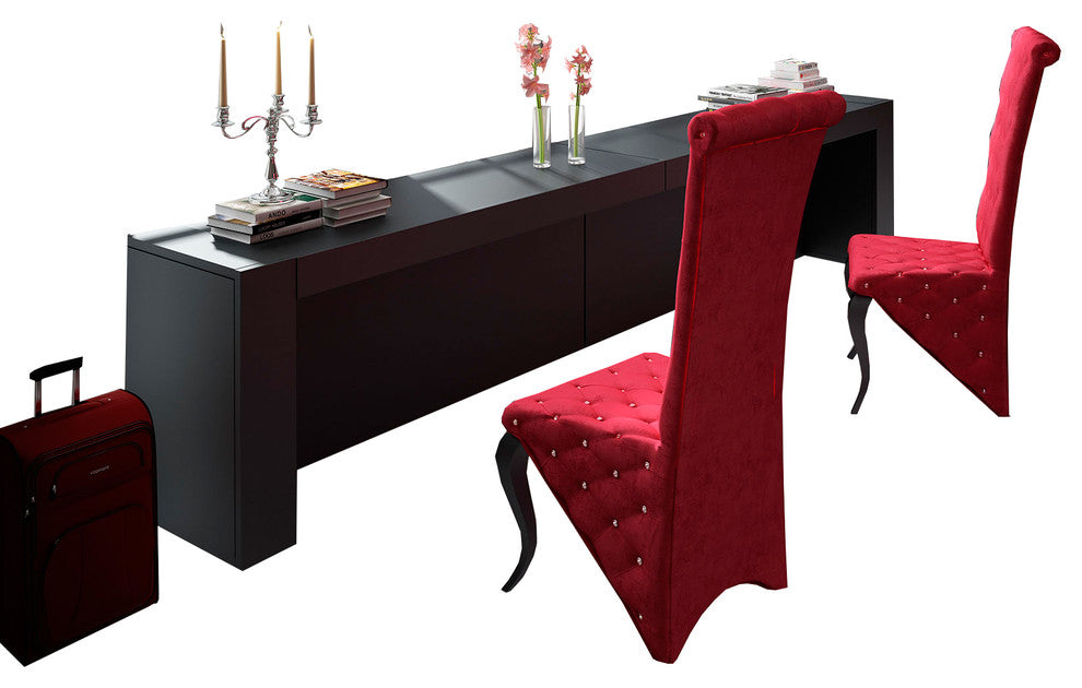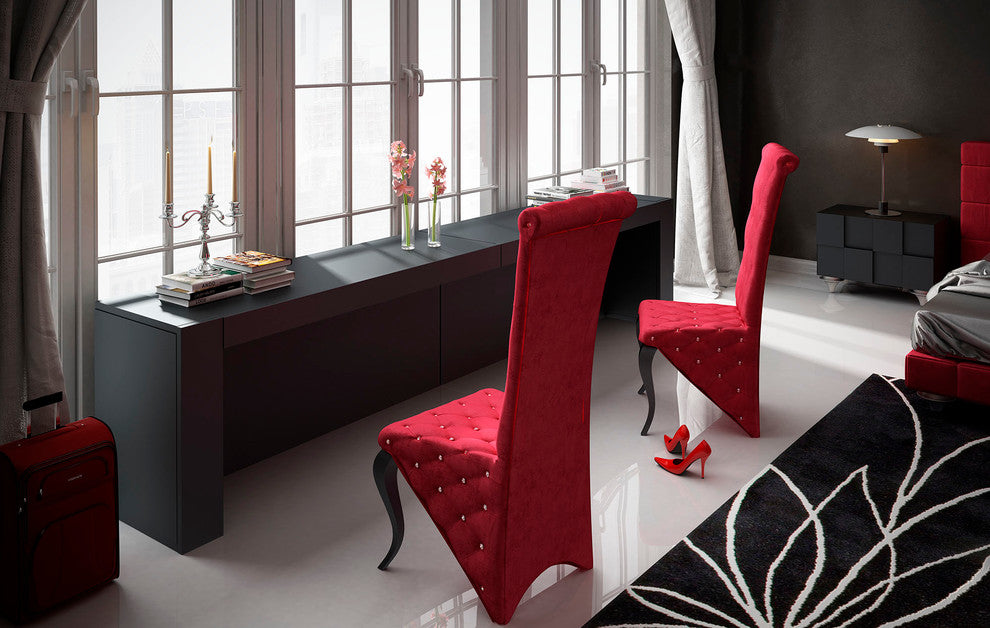 - Please Note- Accessories not includedAdd luxury to your bedroom with this beautiful make-up vanity. Comes with drawer(s) and lots of inner divisions to conveniently accommodate a number of vanity essentials and jewelry. The top flips up to showcase a mirror and reveal a spacious storage area. This set is constructed from MDF board and is sturdy and durable. The set includes: the large vanity + 2 chairs. Any other item in the image is only for decorative purpose, and are not included. Designed and manufactured in Spain (European brand). Dimensions: vanity - 110" w x 20" d x 31.5" h chair - 20" w x 45" h x 24" d