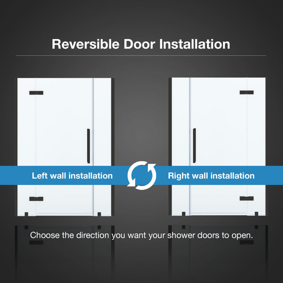 Frameless reversible door installation with built-in door magnet for a secure and tight close; no more leaks, no more wet floors