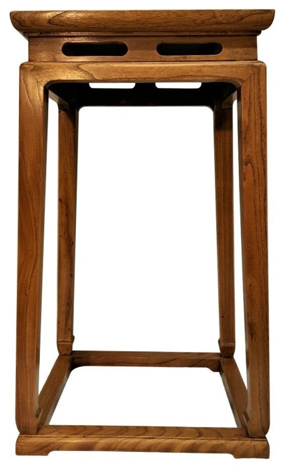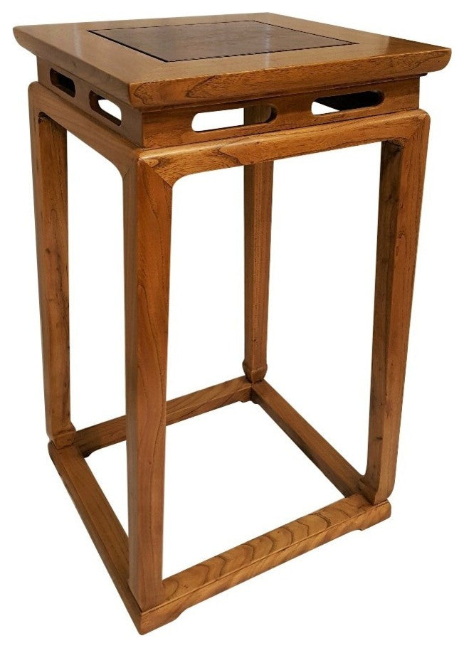 Tapered elegance best describes this Elm wood reproduction Chinese Ming tea table. Makes a conversation piece in any home and highlights any Art object when used as a pedestal with its clean lines. Rich wood grain, Burl wood top and simple lines is a good choice for your bed room as a night stand, end table or plant stand. Made of solid elmwood highlighted in clear lacquer with deep red mahogany burl top. Try a pair on each side of a stair case or bed. • Solid Elm wood. • Mahogany burl top • Clear lacquer highlight finish • Tapered 18"x18"x31"H • Top- 16.5 x 16.5 • Ming styling • Ships Fed Ex, Expertly packaged and insured