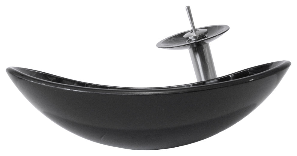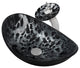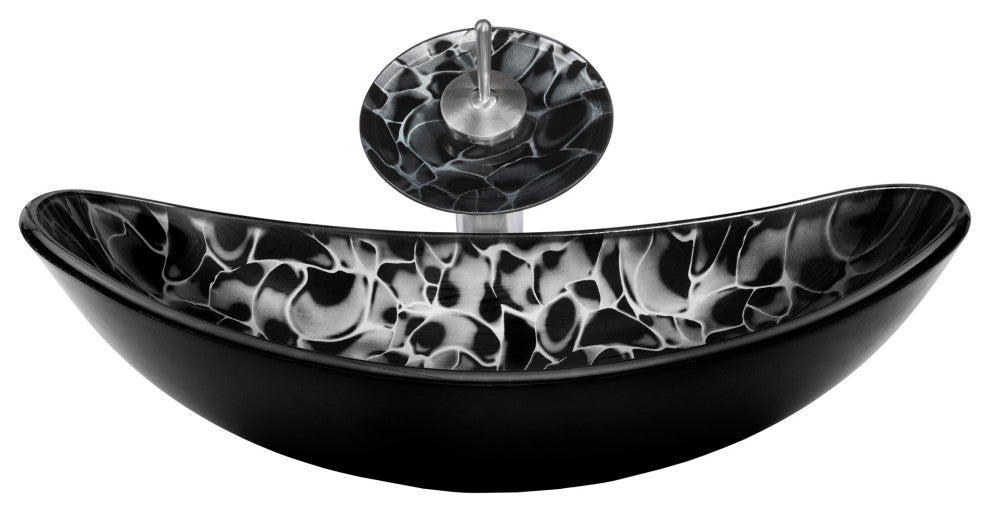 Enhance and harmonize your bath with Novatto''s hand-painted glass vessel and matching brushed nickel waterfall faucet. This glass vessel sink features a bold hand-painted tortoise shell design of black and silver. Novatto uses advanced technology, including computerized glass processing and Italian furnaces, giving our glass basins unmatched structural integrity. This vessel sink and faucet combo is a great way to harmonize the decor by unifying the color and textural design of the bathroom. The matching faucet disc directs the water flow into a graceful waterfall. When a bath demands superior design and quality, Novatto''s glass vessels add that touch. Glass vessel sinks can be used either in a powder room as a focal point or in a master bedroom for everyday use. Novatto''s tempered glass cannot be compared to the everyday synthetic porcelains and ceramics. The glass vessel is constructed from thick half-inch high-tempered glass. The waterfall faucet is constructed from solid brass with a high-pressure ceramic cartridge. The faucet is AB1953 Low Lead compliant. A single handle controls temperature and water flow. This sink and faucet set is designed for an above-counter, single-hole installation. Standard 1.75-inch sink drain opening with standard U.S. plumbing connections. A matching brushed nickel mounting ring and 1.5-inch pop-up drain is included. Glass Vessel Dimensions: 21.5" x 13.5" x 6", Overall Faucet Height: 11.5 inches; Spout Height: 8.625 inches; Spout Reach: 3.625 Inches. Just add water and enjoy Novatto''s Limited Lifetime Limited Warranty. Supreme packaging and boxing ensure damage-free delivery. Details:Includes: glass vessel sink, vessel faucet, pop-up drain, mounting ringThe sink is constructed from thick high-tempered glassThe faucet is constructed from solid brass with a high-pressure ceramic cartridgeAB1953 low lead compliantMatching pop-up drain and mounting ring included