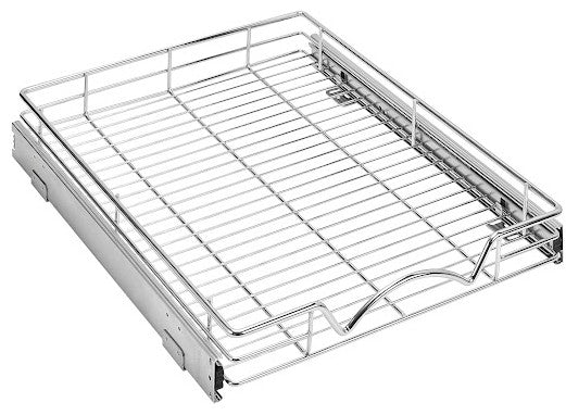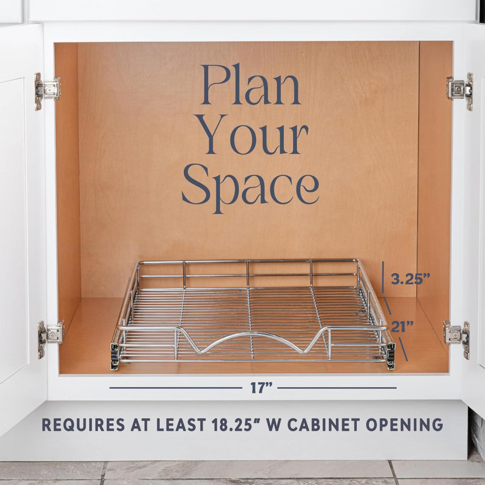 A MUST HAVE PULL OUT DRAWER: This sliding cabinet organizer installs in under 30 minutes and makes it super easy to store, organize, and access spice rack, pots, and baking sheets.SMOOTH SLIDE-OUT DRAWER: This kitchen cabinet roll out shelf is manufactured with a pull out system that slides out ultra-smooth. Other than other drawer organizers, our Pull Out Cabinet shelf slides out all the way, providing you with easy access.RELIABLE SHELF INSERTS FOR CABINETS: Our adjustable sliding cabinet organizer features elegant heavy wire construction which is durable enough to handle up to 50 pounds.EASY TO INSTALL & HARDWARE INCLUDED: Our pull out cabinet organizer dimensions measure 17"?W x 21"?D x 3.15"? and includes simple step-by-step instructions along with all of the hardware necessary for easy installation. Installs with just a few simple screws, and Fits cabinet openings 18-1/4"?and largerHIGH QUALITY: Made of durable metal with chrome finish the pull out shelf for kitchen cabinet is simple and easy to install. Designed to fit any style of cabinetry and easy to clean.
