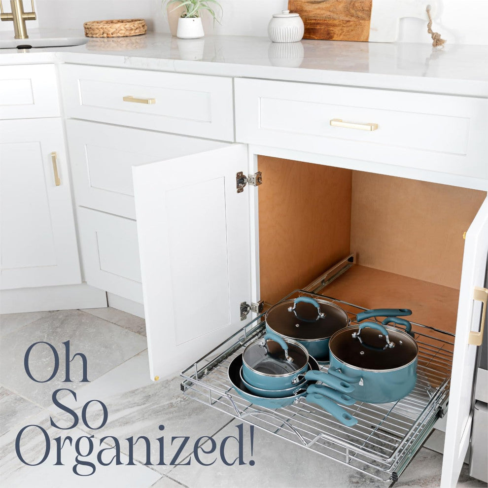 A MUST HAVE PULL OUT DRAWER: This sliding cabinet organizer installs in under 30 minutes and makes it super easy to store, organize, and access spice rack, pots, and baking sheets.SMOOTH SLIDE-OUT DRAWER: This kitchen cabinet roll out shelf is manufactured with a pull out system that slides out ultra-smooth. Other than other drawer organizers, our Pull Out Cabinet shelf slides out all the way, providing you with easy access.RELIABLE SHELF INSERTS FOR CABINETS: Our adjustable sliding cabinet organizer features elegant heavy wire construction which is durable enough to handle up to 50 pounds.EASY TO INSTALL & HARDWARE INCLUDED: Our pull out cabinet organizer dimensions measure 30"?W x 21"?D x 3.15"? and includes simple step-by-step instructions along with all of the hardware necessary for easy installation. Installs with just a few simple screws, and Fits cabinet openings 31-1/4"?and largerHIGH QUALITY: Made of durable metal with chrome finish the pull out shelf for kitchen cabinet is simple and easy to install. Designed to fit any style of cabinetry and easy to clean.