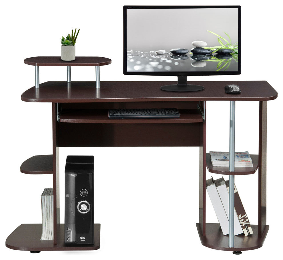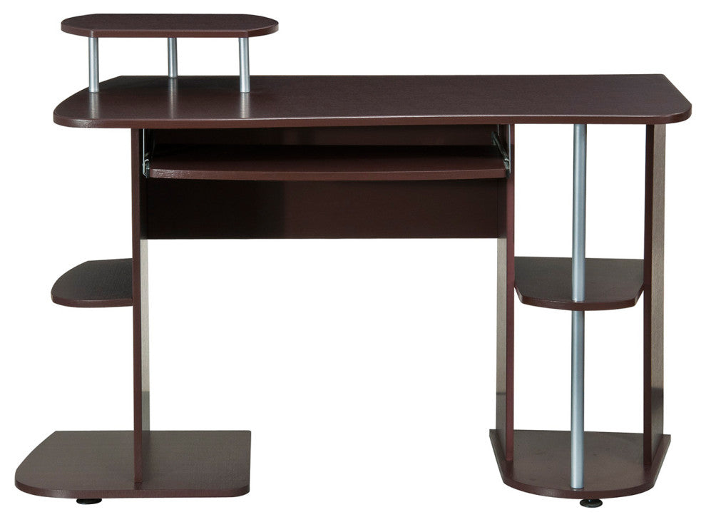 This Techni Mobili Computer Workstation Desk incorporates abundant shelving into a compact, sturdy, and stylish design. It features a slide-out keyboard panel equipped with a safety stop, an elevated desktop accessory shelf, several shelves and a CPU/storage platform. The desktop has an 80lbs weight capacity, the shelves all have 30lbs weight capacities, with the exception of the small shelf behind the media rack which can hold up to 10lbs. The multifunctional desk is made of heavy-duty MDF panels with laminate veneer. It''s scratch-resistant powder-coated steel frame adds a nice touch to it''s elegant look.