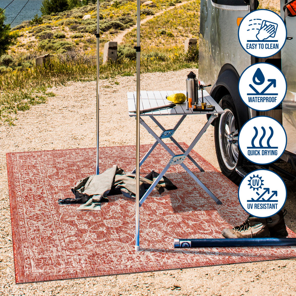 With a vine-and-border design inspired by Persian rugs, our Boho-chic rug adds eclectic style to an outdoor porch or patio. Varied tones of red and rust mingled with a taupe pattern give this rug a hand-woven, vintage vibe. The flatweave design is great for high-traffic spaces indoors too.Features:• Flat-weave construction of 100% polypropylene• Red and taupe with a handwoven mingled texture• Water resistance with 0.19" pile• 100% Polypropylene• No backing, use of rug pad is recommended (sold separately)• Power Loomed in Turkiye• Actual Dimension: 7 ft 9 in. x 7 ft 9 in. Round• Color: Red/Taupe• Thickness measures: 0.19 in.• Available in multiple sizes and/or colorsRug Care:• Vacuum regularly and spot clean as needed; avoid direct and continuous exposure to sunlight; use brushless vacuum; remove spills immediately; if liquid, blot with clean, undyed cloth by pressing firmly around the spill to absorb as much as possible; for hard to remove stains, professional rug cleaning is recommended; store in a dry, well ventilated area and rotate for consistent wear• Packing and shipping may cause temporary creases in rugs, which will flatten out after a week on the floor; to expedite the process, try back-rolling your rug before laying it down, and then allow ample time for the remaining creases to relax• Please Note: Due to differences in monitors, some rug colors may vary slightly. Lengths and widths may vary from the published dimensions. Patterns may vary slightly according to shape and size selected.About us:Style your floors with JONATHAN Y. By combining fine craftsmanship and design, this New York creative studio is bringing fashion to your floors. The collection mixes sustainable organic materials, vibrant colors and trend worthy styles to create JONATHAN Y''s distinctive catalog of rugs.