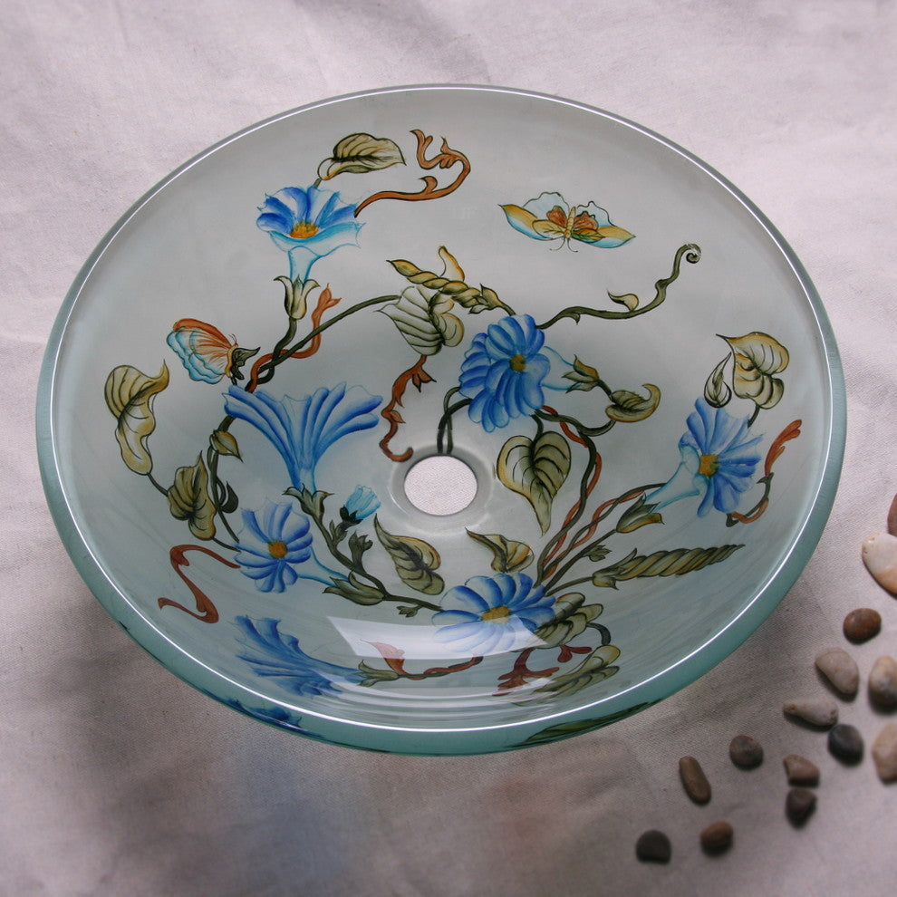 This Vessel Bathroom Sink with its lovely pattern is the perfect solution to your washing requirements. Made from tempered glass, this sink further complements your bathroom with its matching chrome pop-up drain in the center and mounting ring. It is available in a range of finishes for you to choose from. The sink is circular in shape and resistant to fire, scratch, shock, rust and UV light. The Vessel Bathroom Sink is eco-friendly, antimicrobial, non-toxic, and drip free. It can even be used outdoors. The sink is simple to maintain as you only need to wipe it with glass cleaner and a dry cloth. Finish: Anges Twmpes
